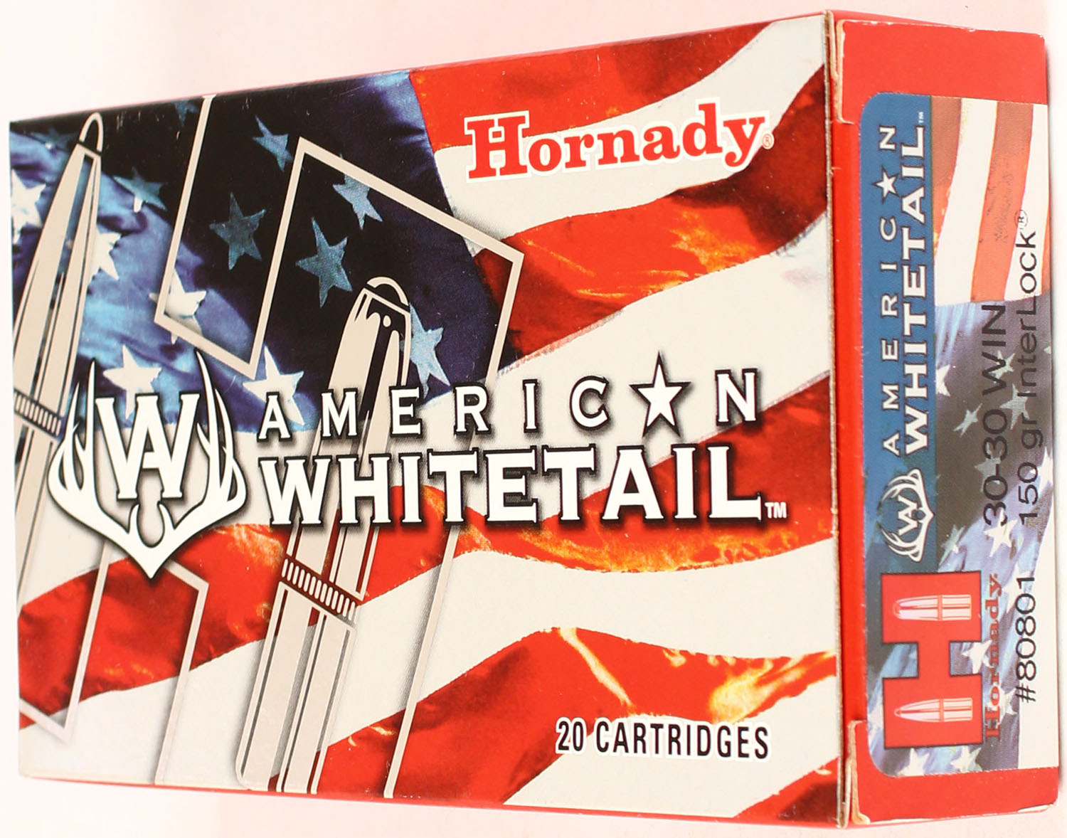 Hornady, American Whitetail, 30-30 Win, 150 Grain Interlock, Full, 1pc. multi-colored box, box is solid but has tape damage with excellent color, Ammo is excellent. Grade: Excellent ++ - Value: 20 to 80