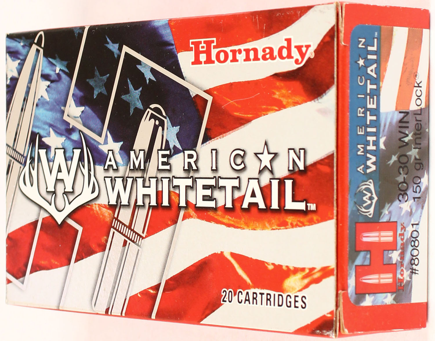 Hornady, American Whitetail, 30-30 Win, 150 Grain Interlock, Full, 1pc. multi-colored box, box is solid but has tape damage with excellent color, Ammo is excellent. Grade: Excellent ++ - Value: 20 to 80