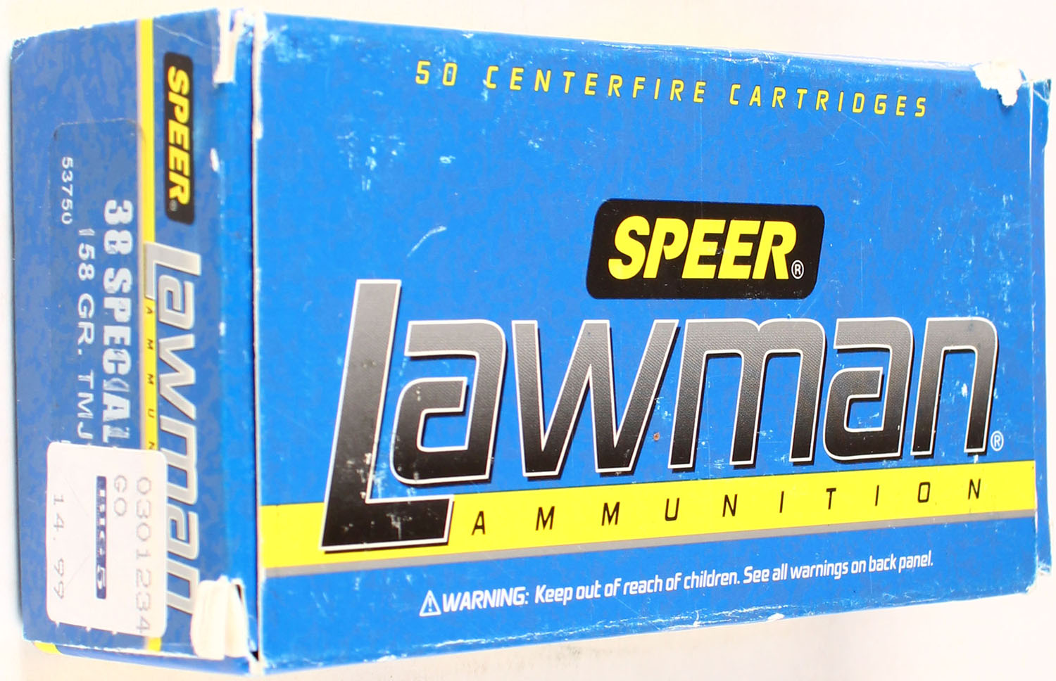 Speer, Lawman, 38 Special +D, 158 Grain TMJ, Full, 1pc. multi-colored box, box is solid, with excellent color, Ammo is excellent. Grade: Excellent ++ - Value: 20 to 80