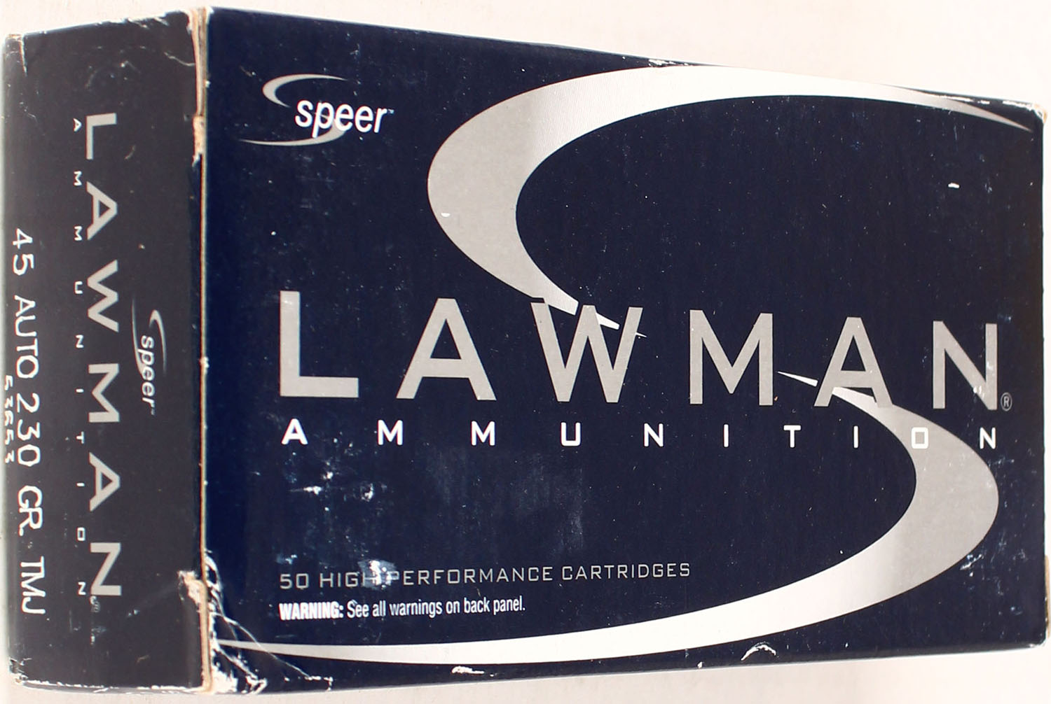 Speer, Lawman, 45 Auto, 230 Grain TMJ, Full, 1pc. multi-colored box, box is solid, with excellent color, Ammo is excellent. Grade: Excellent ++ - Value: 20 to 80