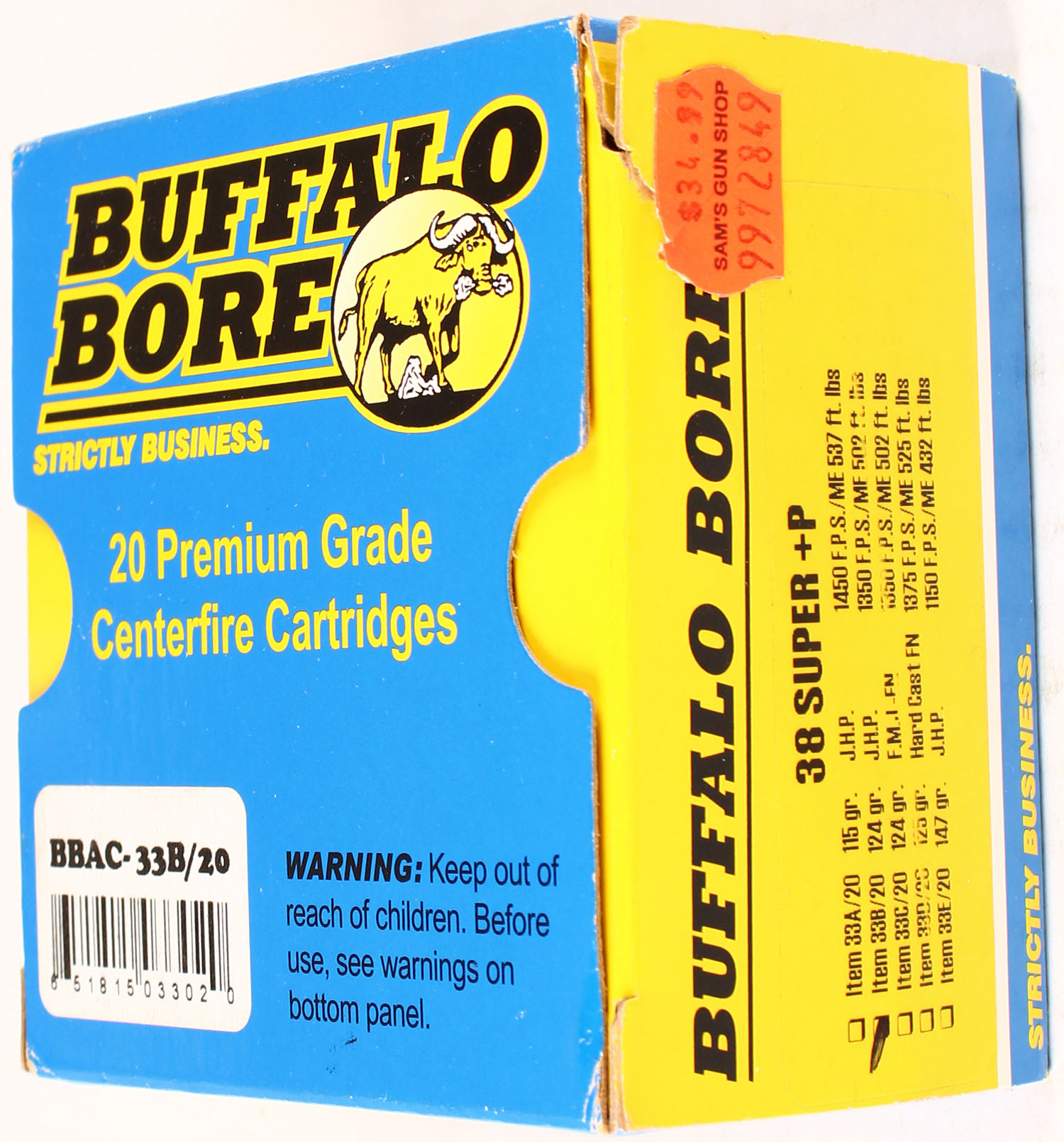 Buffalo Bore, 38 Super +P, 124 Grain JHP, Full, 1pc. multi-colored box, box is solid, with excellent color, Ammo is excellent. Grade: Excellent ++ - Value: 20 to 80