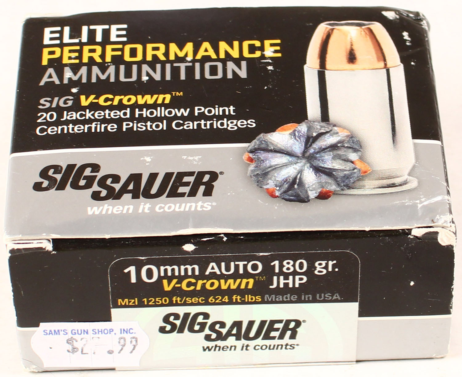 Sig Sauer, Elite Performance, 10mm Auto, 180 Grain JHP, Full, 1pc. multi-colored box, box is solid but has corner damage, with excellent color, Ammo is excellent. Grade: Excellent ++ - Value: 20 to 80