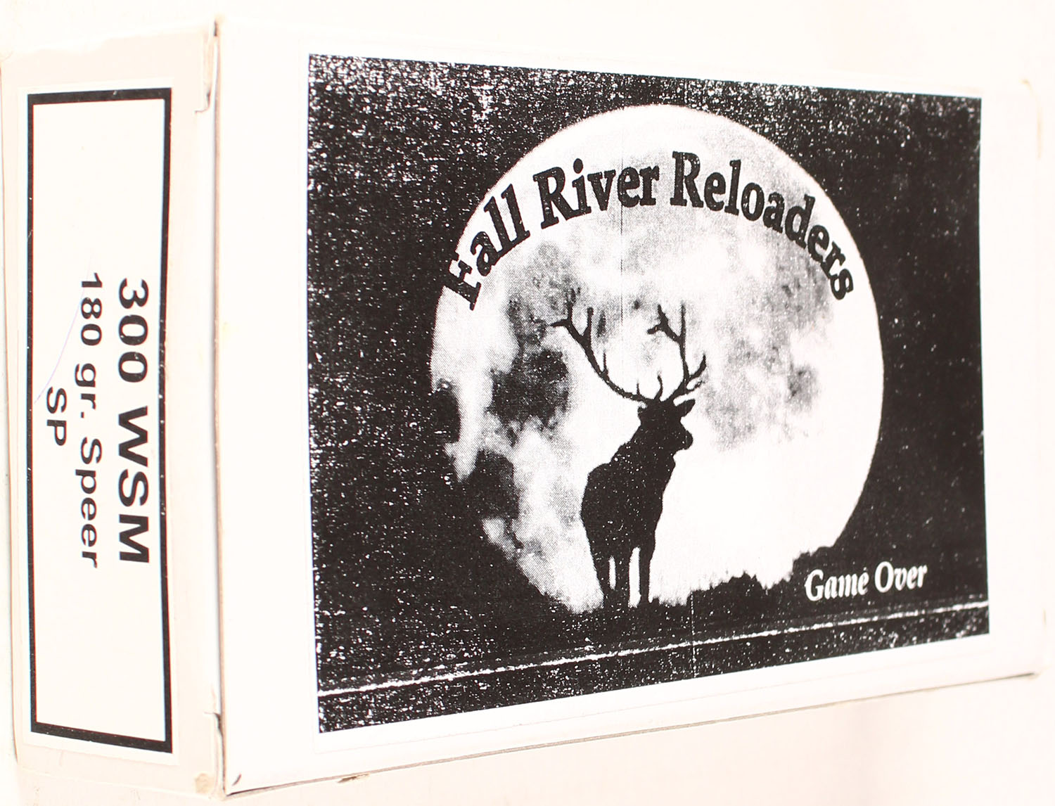 Fall River Reloading, Game Over, 300 WSM, 180 Grain Speer SP, Full, 1pc. multi-colored box, box is solid, with excellent color, Ammo is excellent. Grade: Excellent ++ - Value: 4 to 80