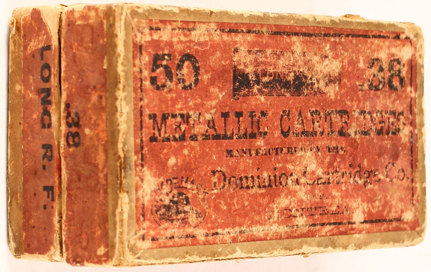 Dominion, Metallic Cartridges, .38 Long Rim Fire, Partial 48rds., 2pc. Buff box with red top & side sealing labels, box is solid with fair to good color, age soiling, heavy shelf wear, edge & corner wear, labels are 90% intact, ammo is fair to good. Grade: Very Good - Value: 20 to 100