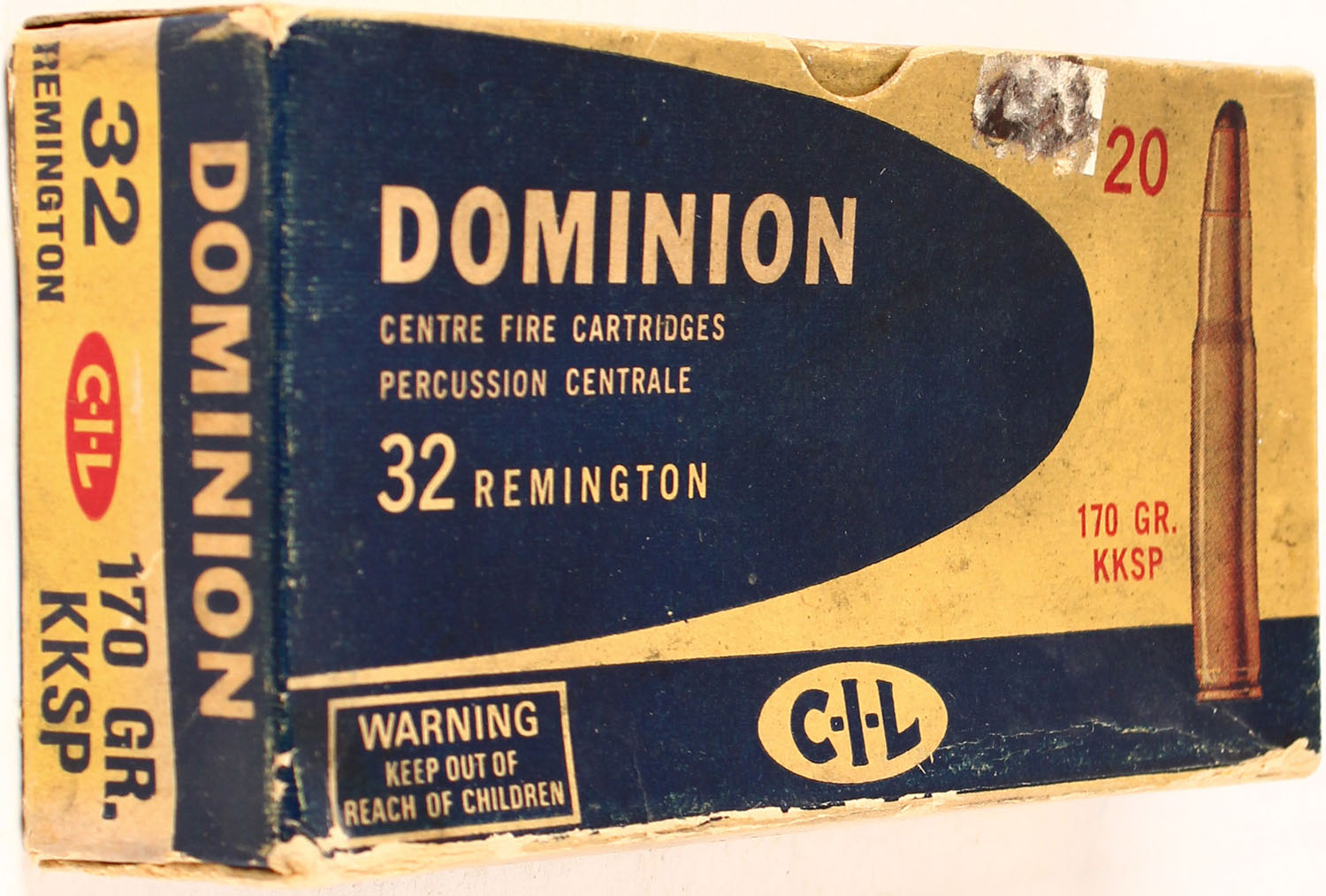 CIL, Dominion, 32 Remington, 170 Grain KKSP, Full, 1pc. Multi-colored box, box is solid, has nice color but has age soiling, Ammo is excellent. Grade: Excellent - Value: 40 to 120