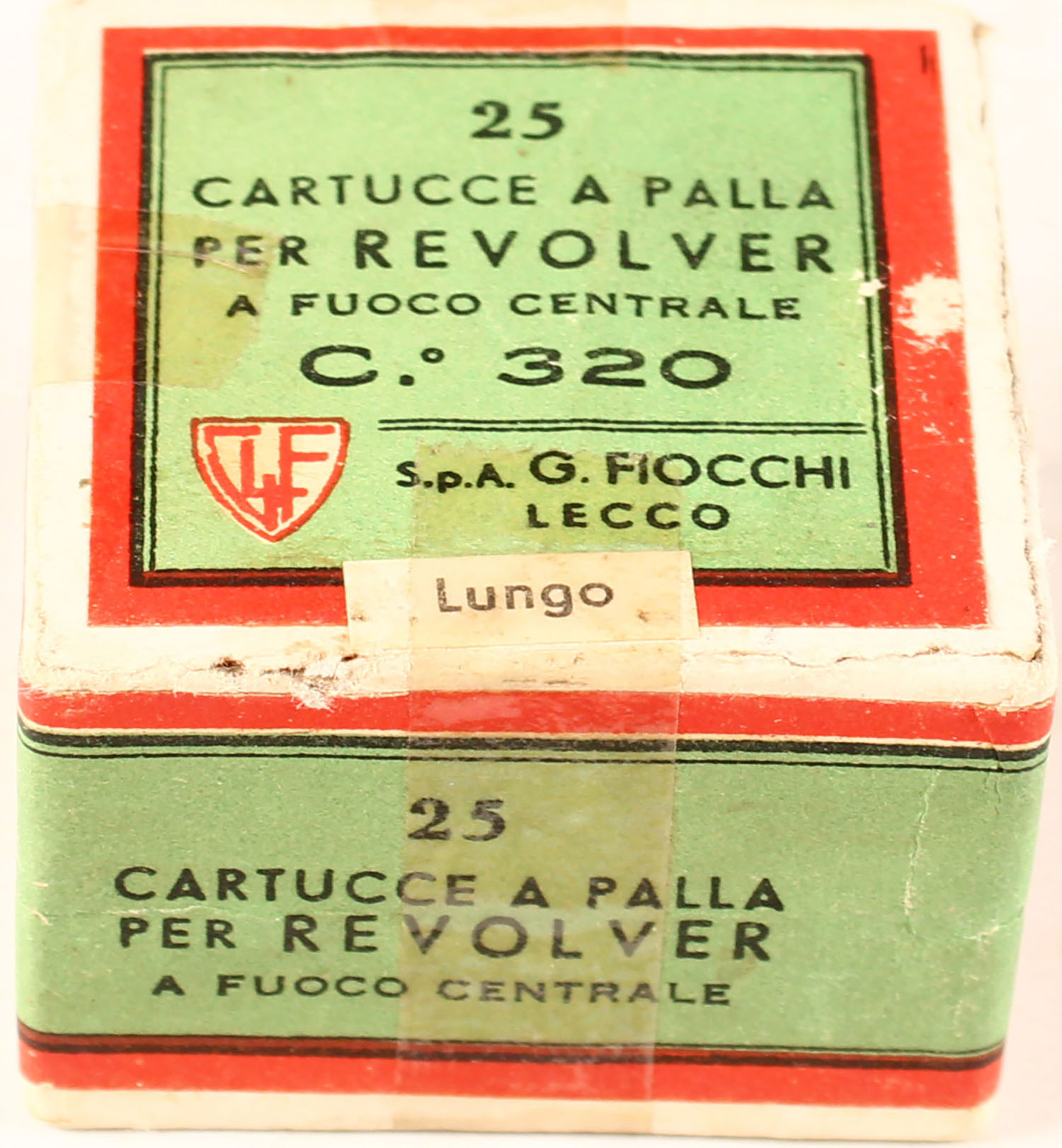 Fiocchi, .320 Center Fire, Ball Cartridges for Revolvers, FULL & SEALED, 2pc. Buff box with green & red top & side sealing labels, box is solid with excellent color, tape on all ends & sides, some edge & corner wear, labels are intact. (1452) Grade: Excellent - Value: 10 to 50