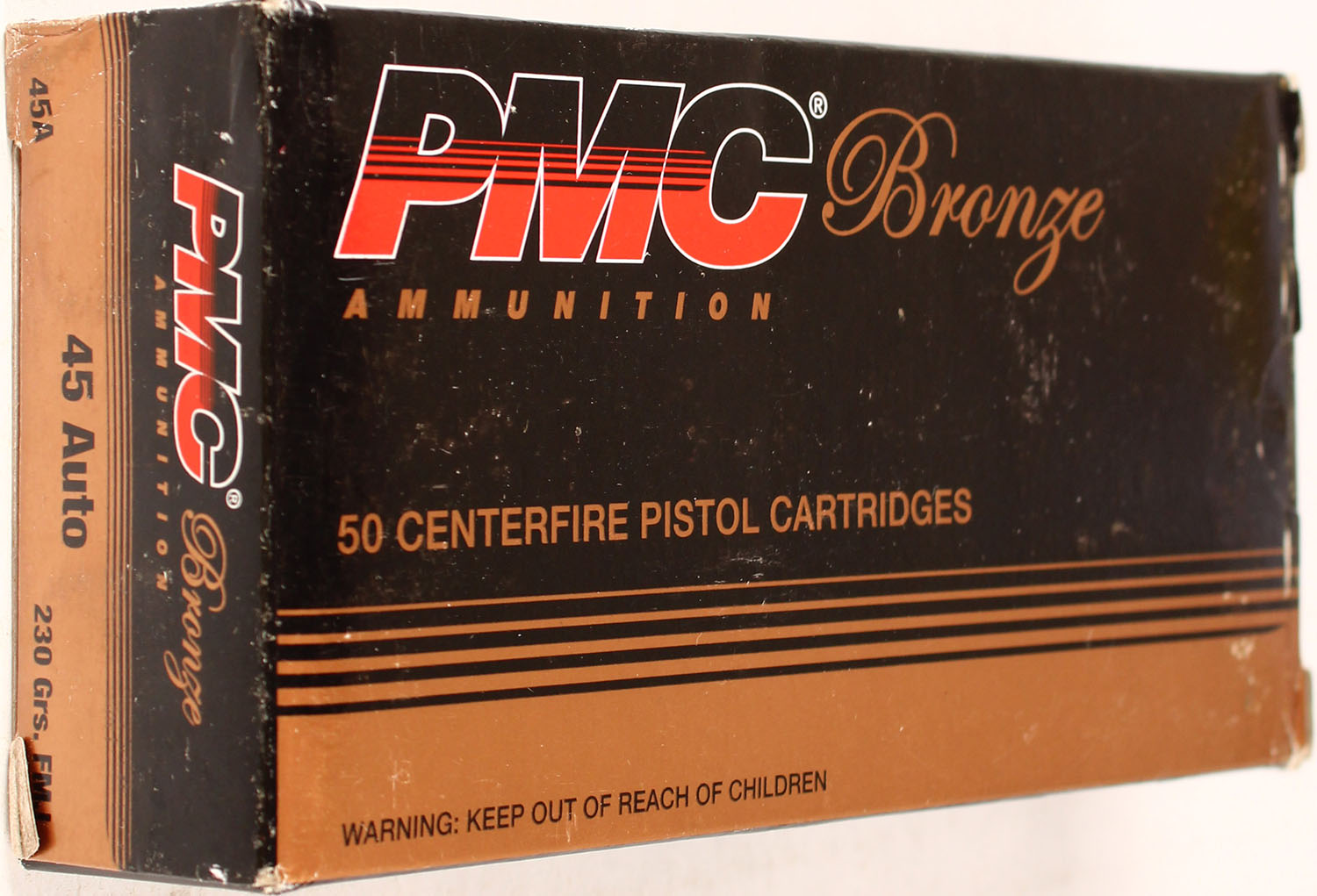 PMC, Bronze, 45 Auto, 230 Grain FMJ, Full, 1pc. Multi-colored box, box is solid, but has light shelf wear with excellent color, Ammo is excellent. Grade: Excellent + - Value: 20 to 80