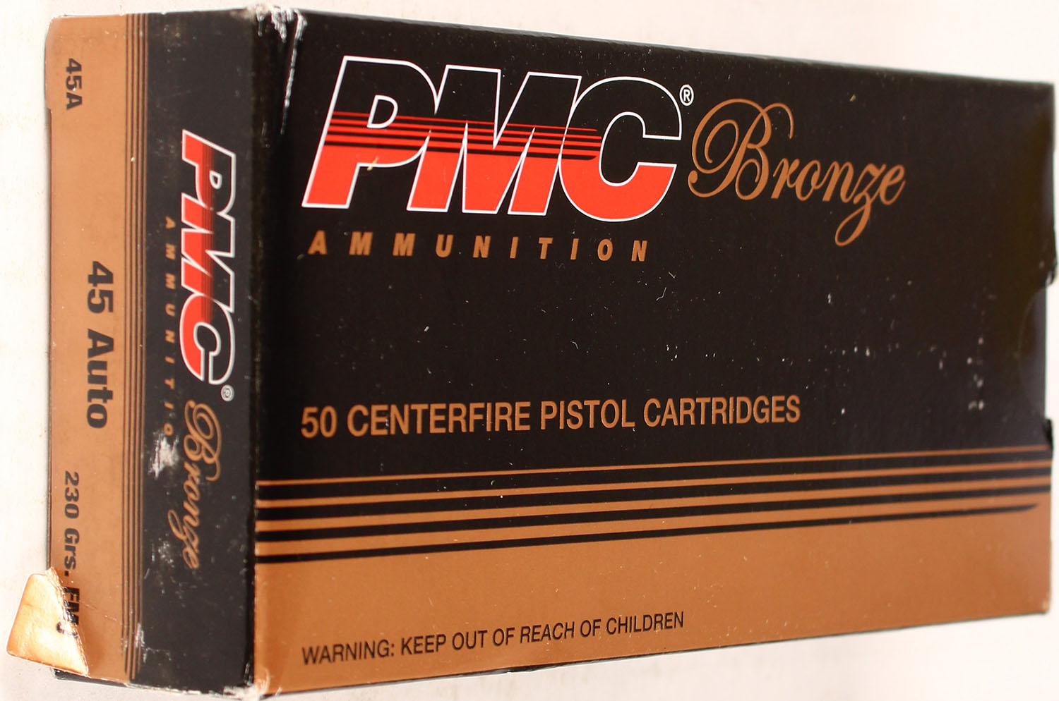 PMC, Bronze, 45 Auto, 230 Grain FMJ, Full, 1pc. Multi-colored box, box is solid, but has light shelf wear with excellent color, Ammo is excellent. Grade: Excellent + - Value: 20 to 80