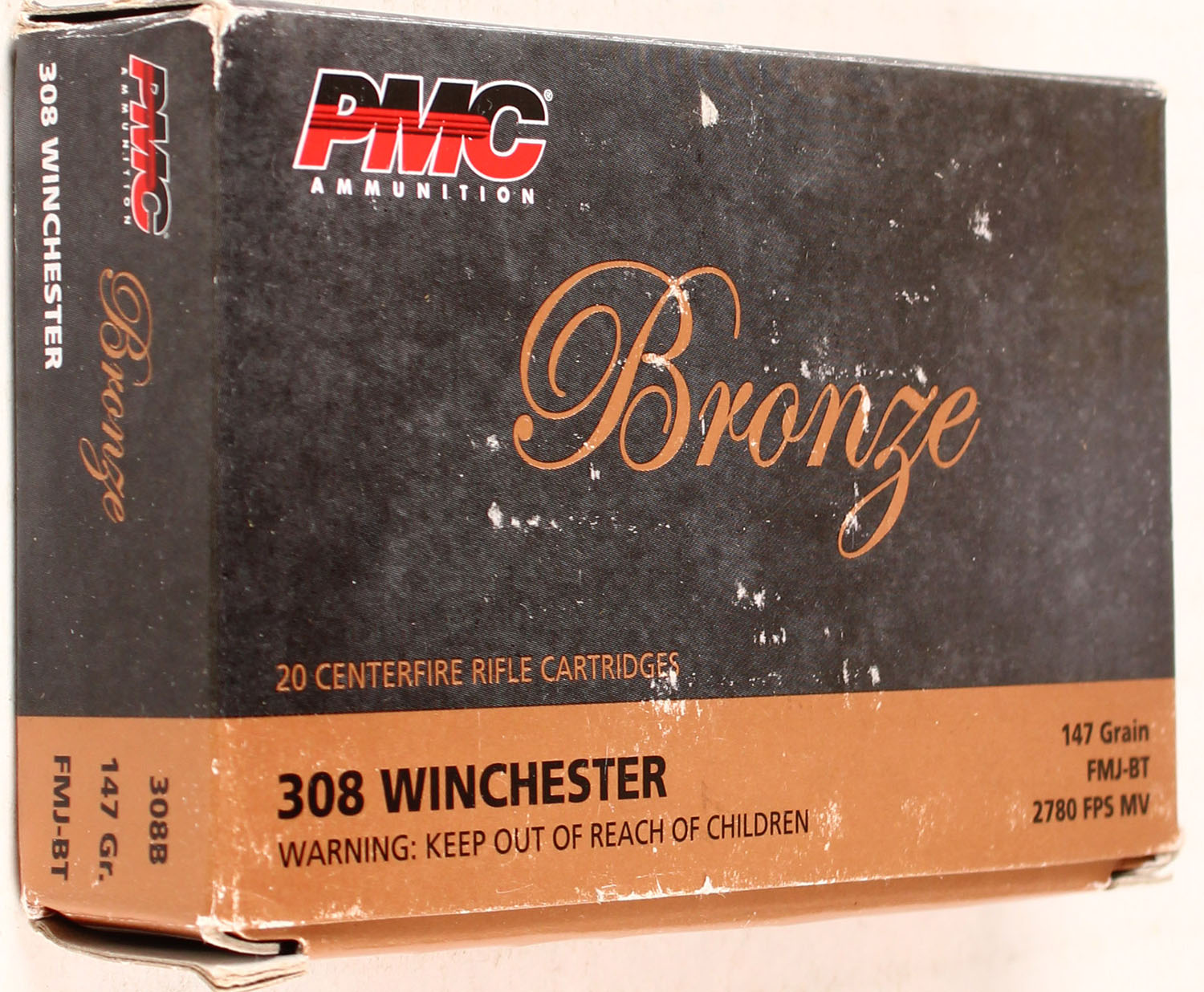PMC, Bronze, 308 Winchester, 147 Grain FMJ-BT, Full, 1pc. Multi-colored box, box is solid, but has light shelf wear with excellent color, Ammo is excellent. Grade: Excellent + - Value: 20 to 80