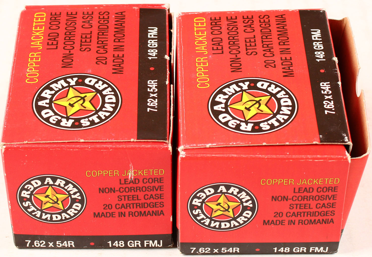 Red Army Standard, Lot of (2) 7.62x54R, 148 Grain FMJ, Full, 1pc., Multi-colored box, boxes are coming apart, with great color, Ammo is excellent. Grade: Excellent - Value: 20 to 80
