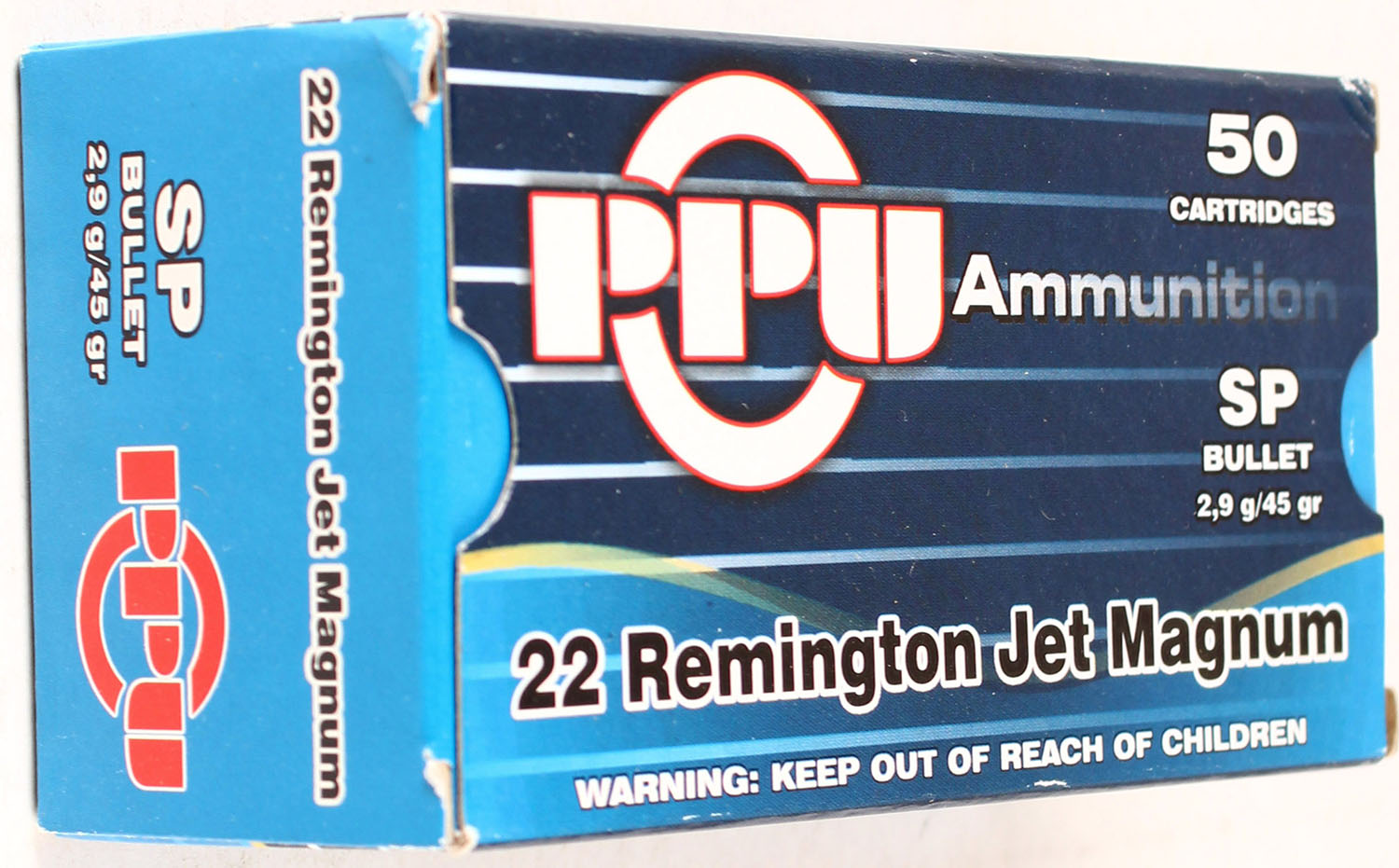 PPU, 22 Remington Jet Magnum, 45 Grain SP, Full, 1pc., Multi-colored box, box is solid with great color, Ammo is excellent. Grade: Excellent ++ - Value: 20 to 80