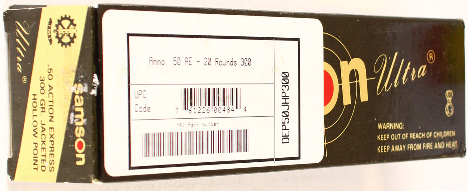 Samson, Ultra, 50 AE, 300 Grain JHP, Full, 1pc., Multi-colored box, box is solid with great color, Ammo is excellent. Grade: Excellent ++ - Value: 20 to 80