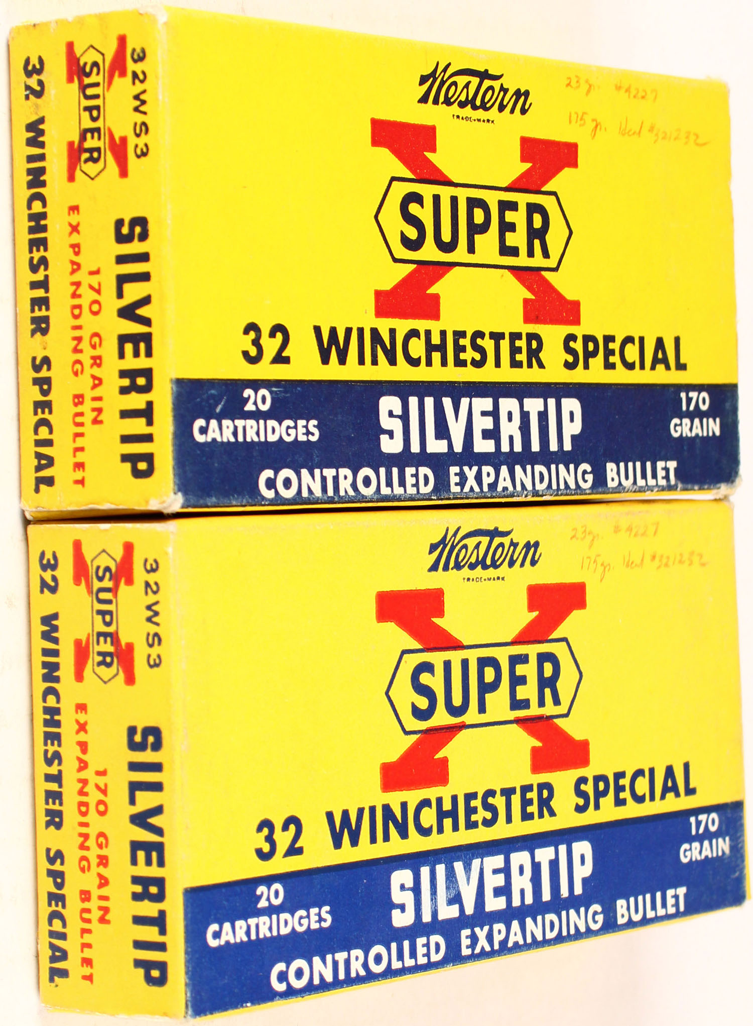 Western, Super X, Lot of (2), 32 Winchester Special, 170 Grain Controlled Expanding Silvertip, Full, 1pc., Multi-colored box, box is solid with great color, Ammo is excellent. Grade: Excellent ++ - Value: 40 to 120