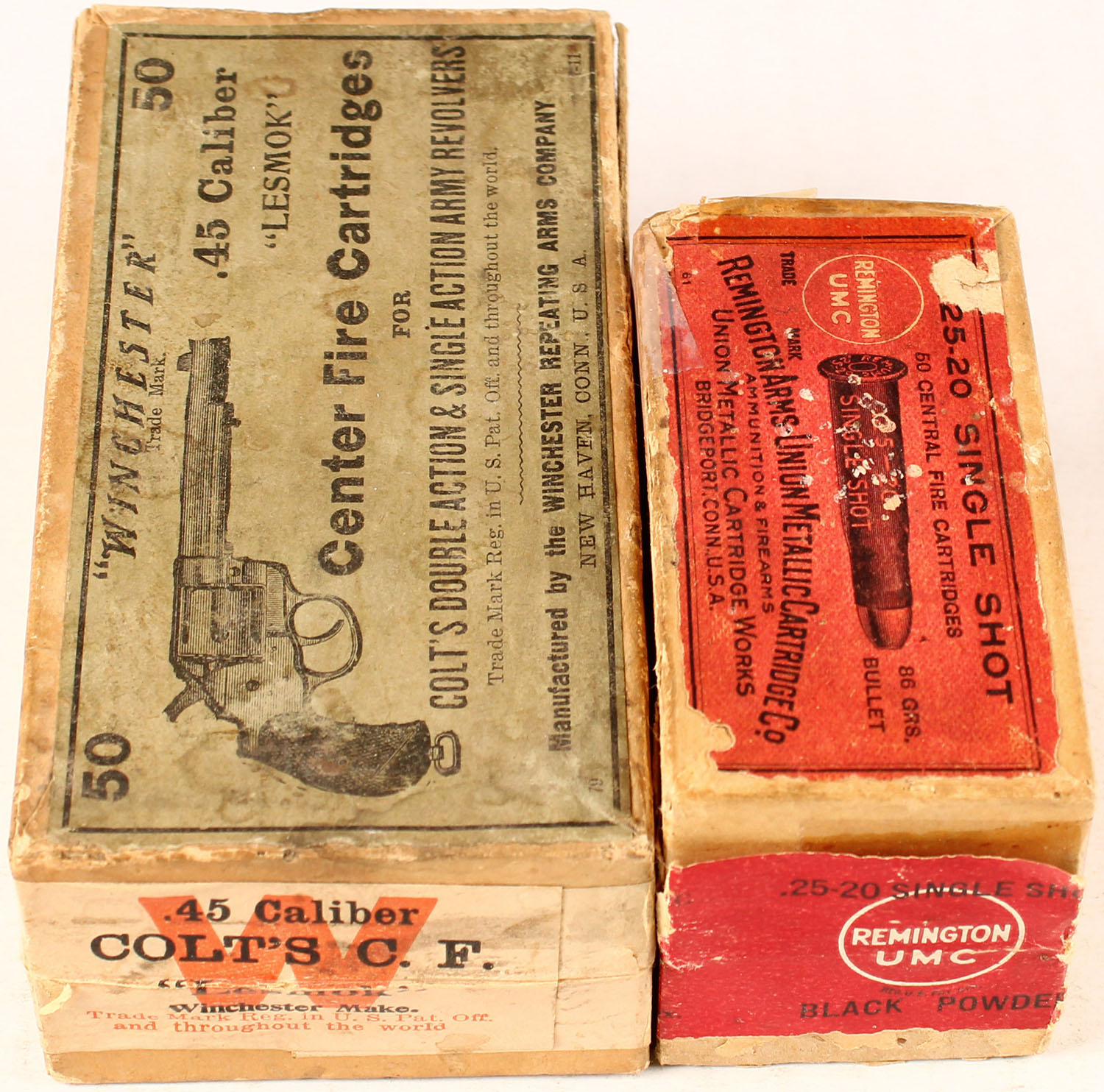 Mixed Mfg., Lot of (2) boxes - .45 Colt (8rds) & .25-20 Single Shot (46rds.), Both boxes partial with mixed ammo, both boxes age soiled and worn. Grade: Very Good + - Value: 10 to 100