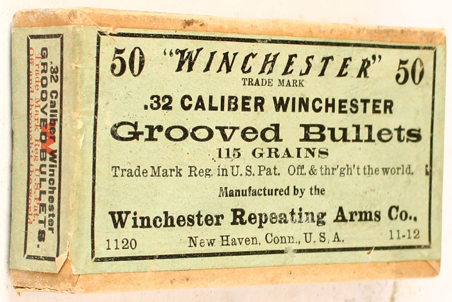 Winchester, .32 Grooved Bullets, 115 Gr., 2pc, Full, buff box with green, black & red label. Grade: Excellent - Value: 20 to 60