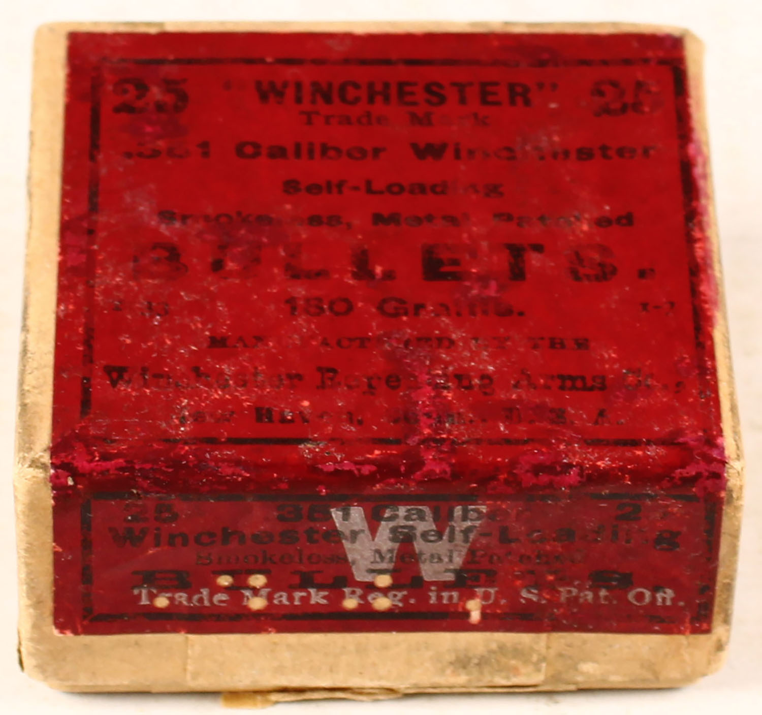 Winchester, .351 Winchester Self Loading Smokeless Metal Patched Bullets, 185 Gr., 2pc, Full, buff box with red & black label. Grade: Excellent - Value: 20 to 60