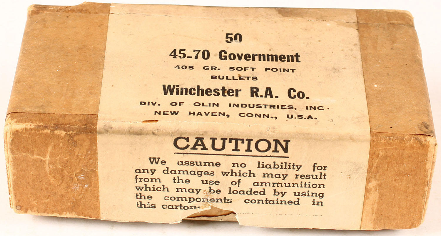 Winchester, .45-75 Government 405 Gr. Soft Point Bullets, 2pc, Partail 38rds., buff box with buff label. Grade: Excellent - Value: 10 to 50