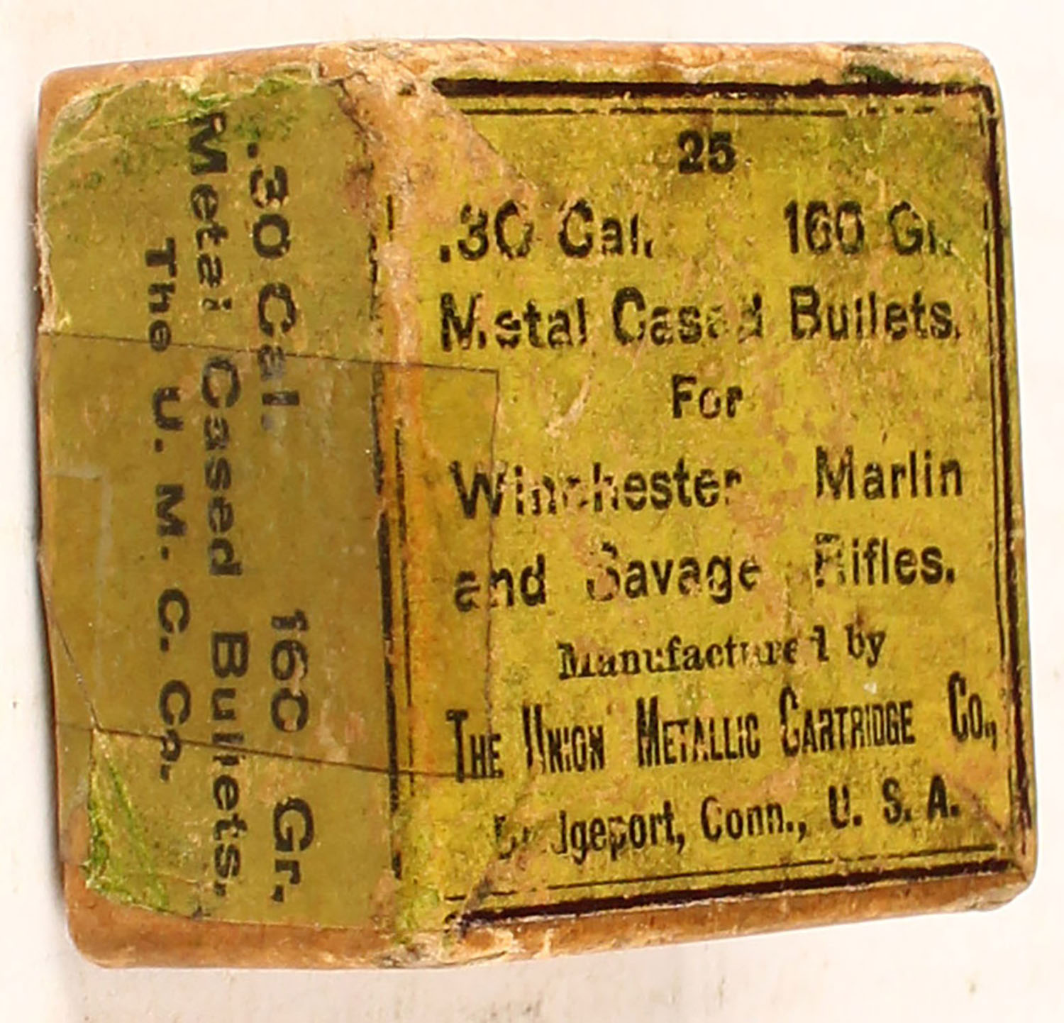 UMC, .30 Cal. 160 Gr. Metal Cased Bullets, Partial 22rds. 2pc. Buff box with green wraparound label, box is solid with very good color, age soiling some shelf wear, tape on left end minor corner wear, edges are mostly crisp, bullets are excellent. Grade: Very Good ++ - Value: 4 to 50