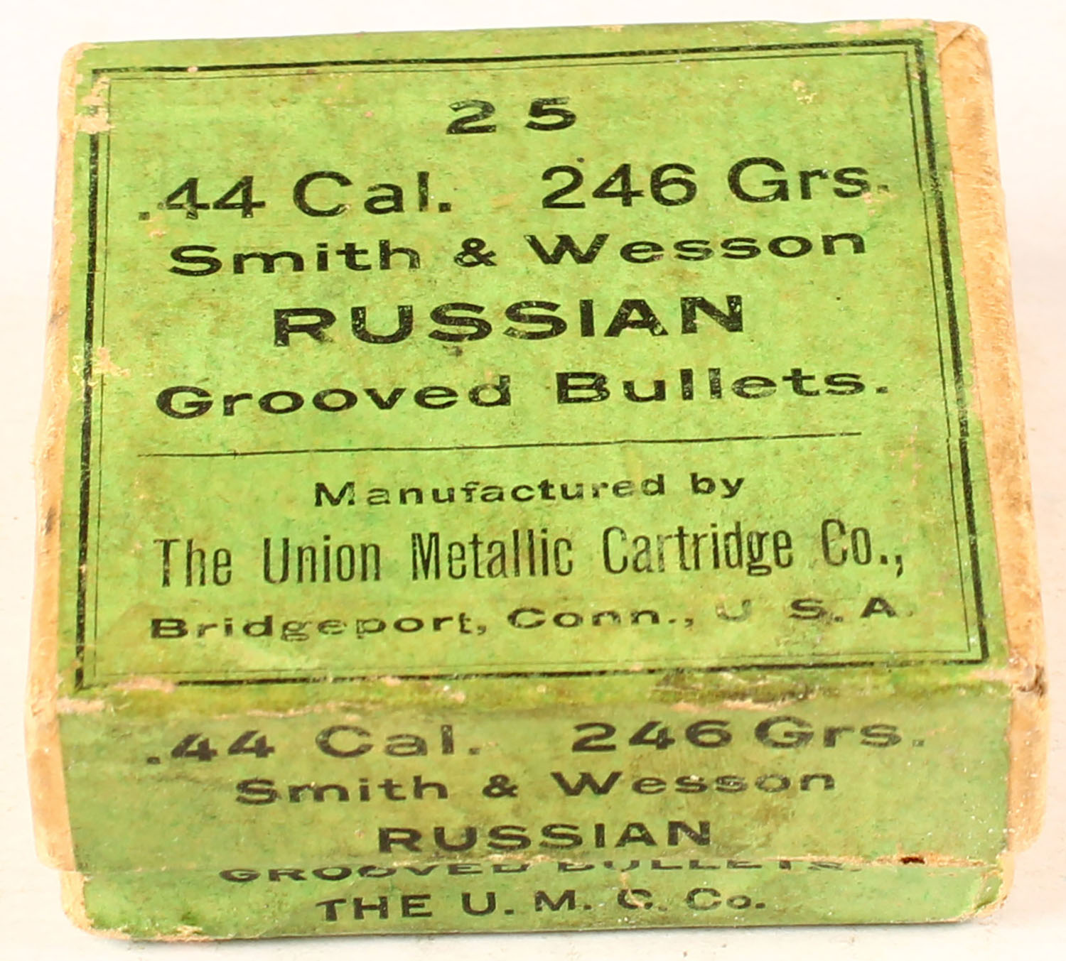 UMC, .44 Cal. 246 Grs. Smith & Wesson Russian, Grooved Bullets, Full, 2pc. Buff box with green wraparound label, box is solid with excellent color, minor age soiling very minor corner wear, edges are crisp, label is intact, bullets are excellent. Grade: Excellent + - Value: 20 to 60