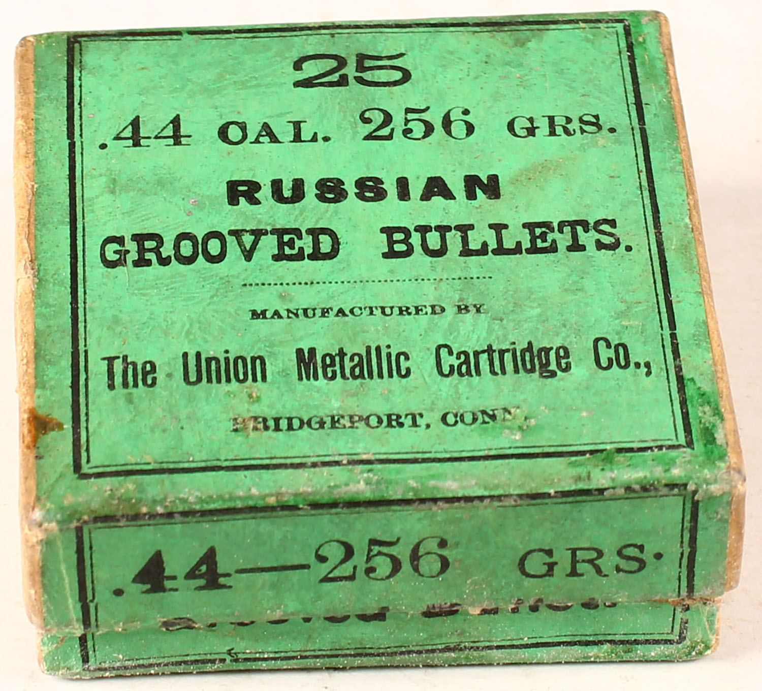 UMC, .44 Cal. 256 Grs. Russian, Grooved Bullets, Partial 23rds. 2pc. Buff box with green wraparound label, box is solid with excellent color, some age soiling, minor corner wear, edges are crisp, label is intact, bullets are very good. Grade: Excellent - Value: 10 to 50