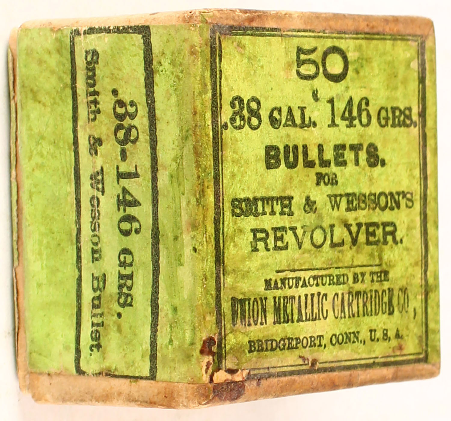 UMC, .38 Cal. 146 Grs. Bullets for Smith & Wesson's Revolver, Full, 2pc. Buff box with green wraparound label, box is solid with very good color, age soiling, very minor corner wear, edges are mostly crisp, labels are intact, bullets are very good. Grade: Very Good ++ - Value: 10 to 60