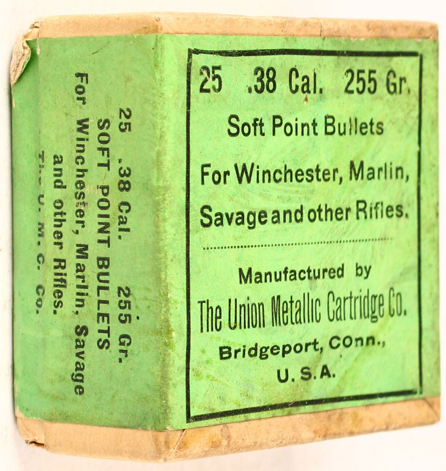 UMC, .38 Cal. 255 Gr. Soft Point Bullets, FULL & SEALED, 2pc. Buff box with green wraparound label, box is solid with excellent color, very minor age soiling, corners are sharp, edges are crisp, label is intact. Grade: Excellent + - Value: 30 to 90