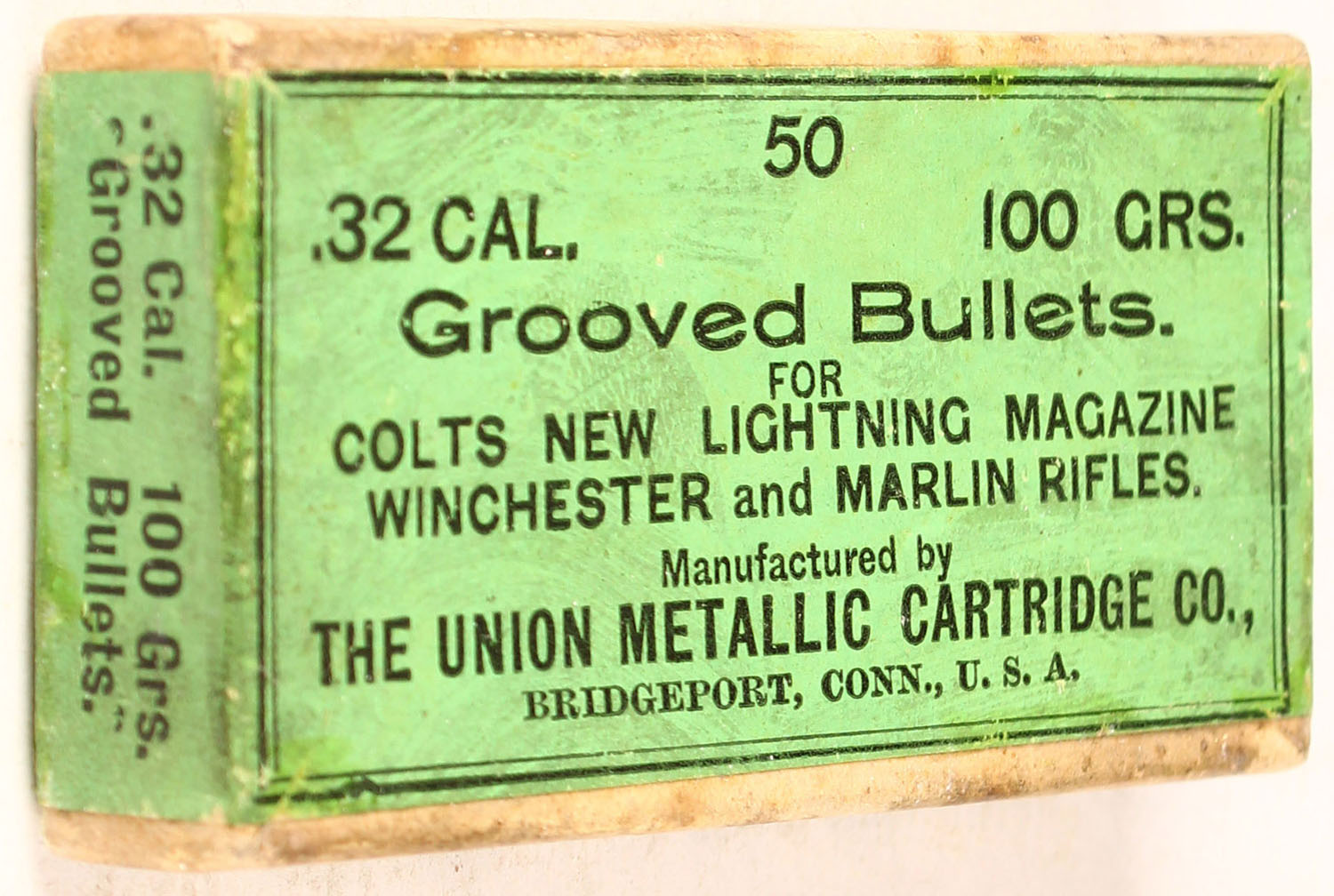 UMC, .32 Cal. 100 Grs. Grooved Bullets for Colts New Lightning Magazine, Full, 2pc. Buff box with green wraparound label, box is solid with excellent color, some age soiling, very minor edge & corner wear, label is intact, bullets are very good to excellent. Grade: Excellent - Value: 20 to 60