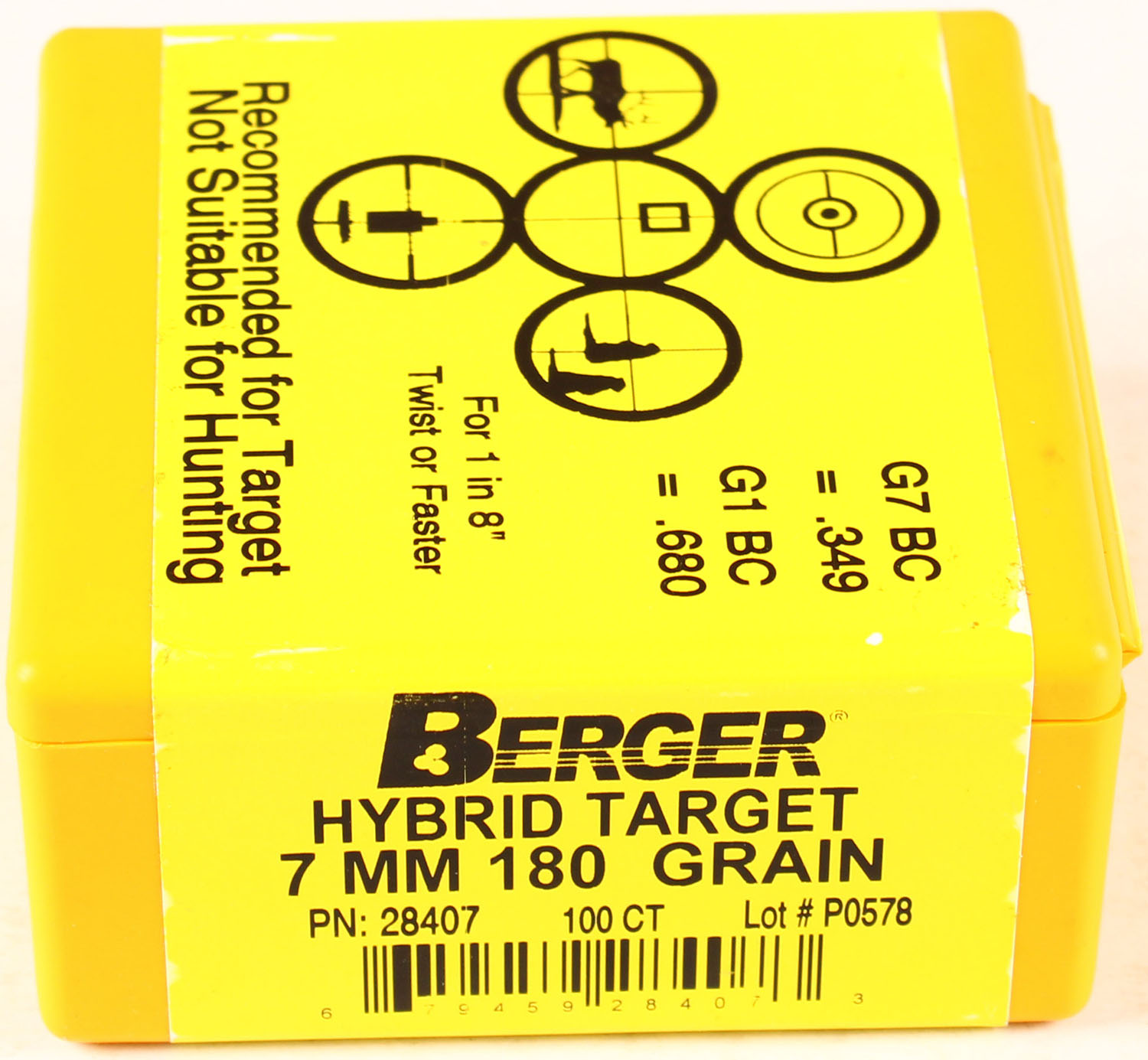 Berger, Hybrid Target, 7mm, 180 Grain J4 Precision Jackets, FULL & SEALED, 1pc., Multi-colored box, box is solid with great color. Grade: Excellent ++ - Value: 10 to 100