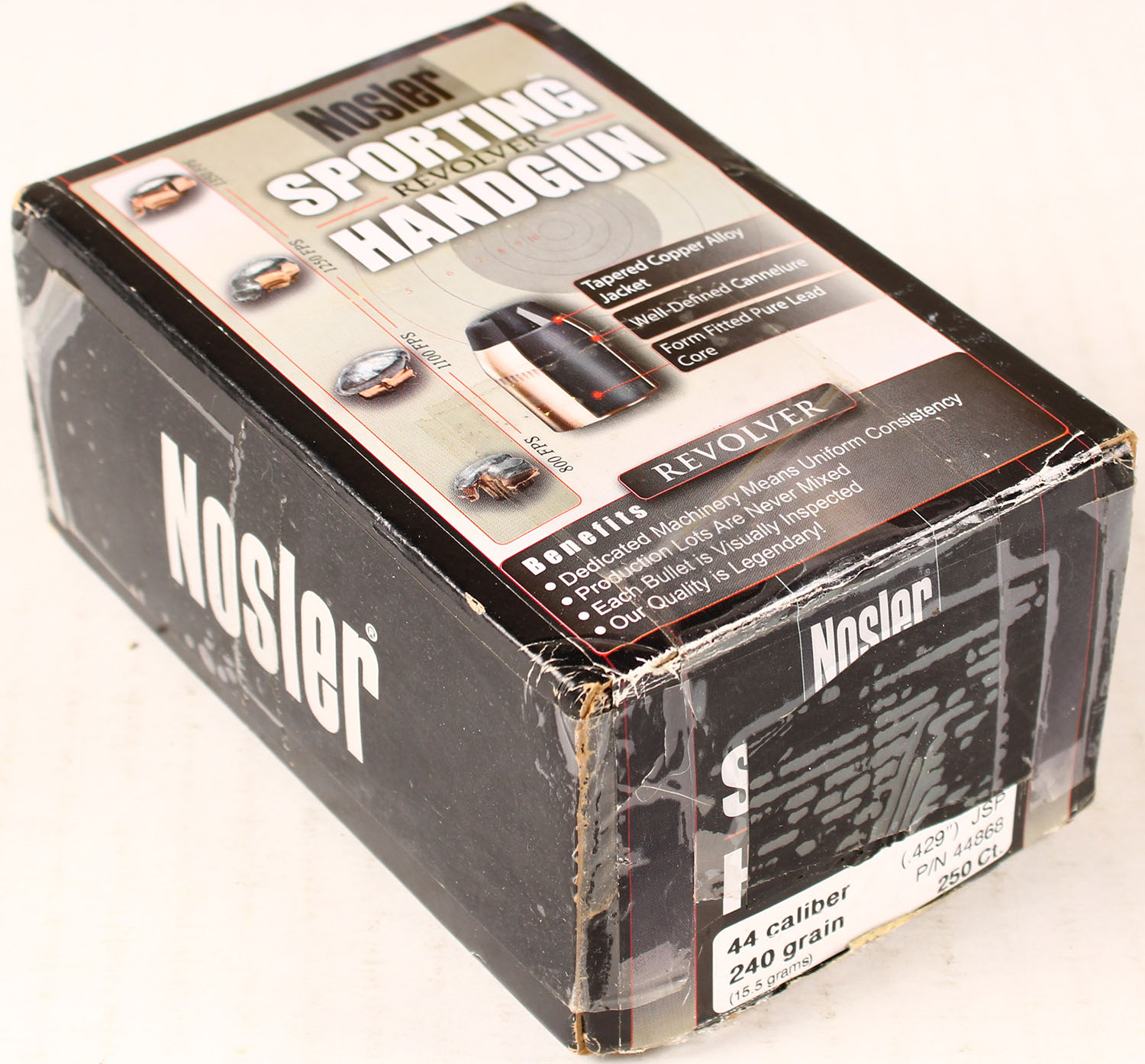 Nosler, Sporting Revolver Handgun, 44 caliber, 240 Grain JSP, Full, 1pc., Multi-colored box, box is falling apart but has been tape repaired with great color, Bullets are excellent. Grade: Excellent - Value: 20 to 100