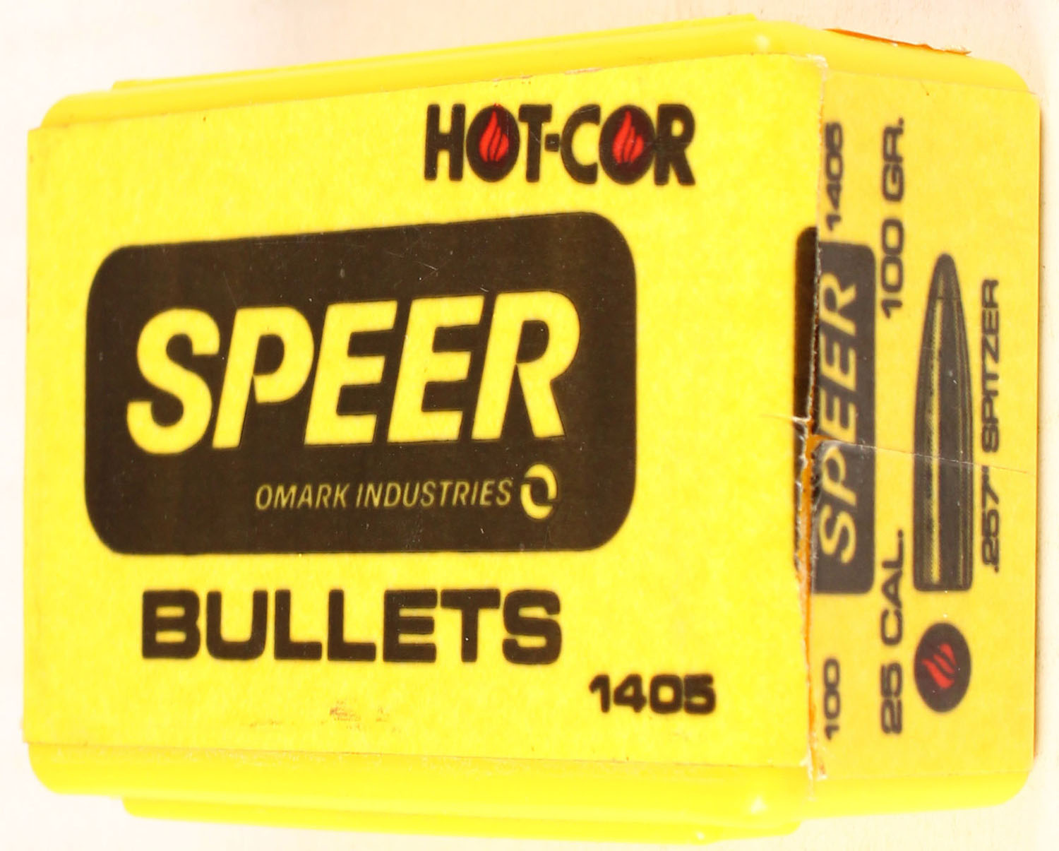 Speer, Hot-Cor, caliber 25, 100 Grain Spitzer, Full, 1pc., multi-colored box, box is solid but top label it torn off with great colors, Bullets are excellent. Grade: Excellent + - Value: 20 to 100