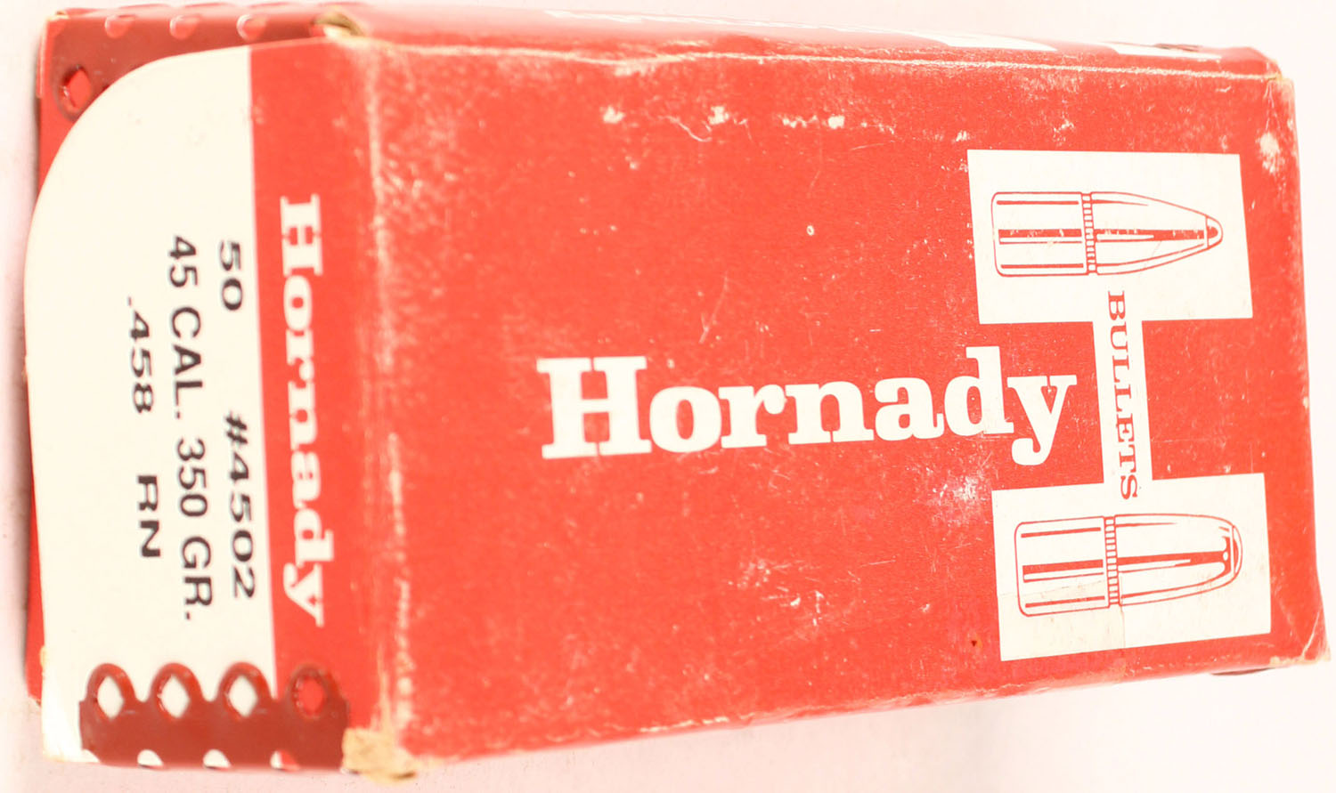 Hornady, caliber 45, 350 Grain RN, Full, 1pc., multi-colored box, box is solid with very nice colors but has light shelf wear, Ammo is excellent. Grade: Excellent + - Value: 20 to 100