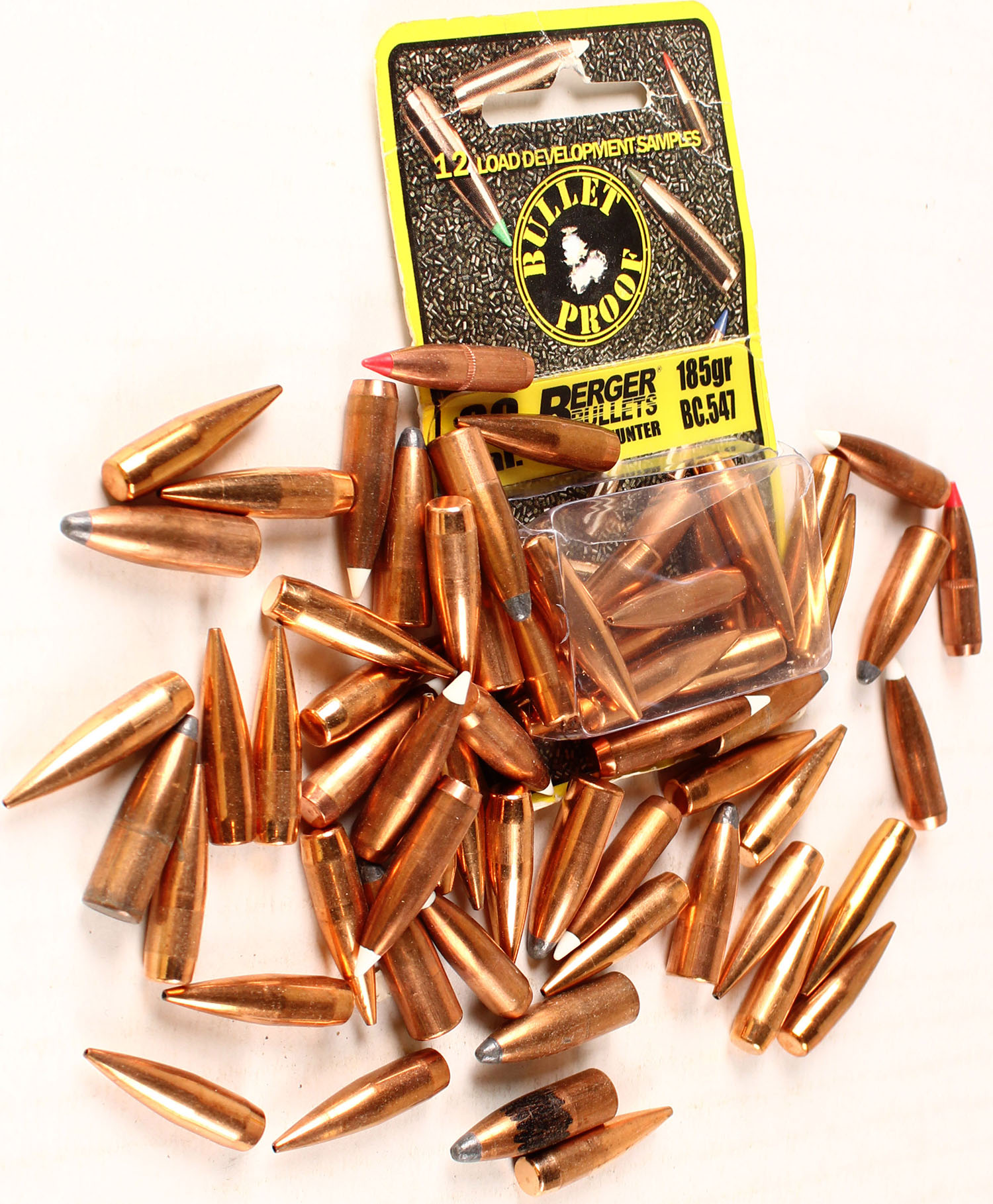 Big lot of mix bullets with Berger box, caliber 30, 185 Grain, Full, 1pc., multi-colored box, box is solid with very nice colors, Ammo is excellent. Grade: Excellent - Value: 10 to 100