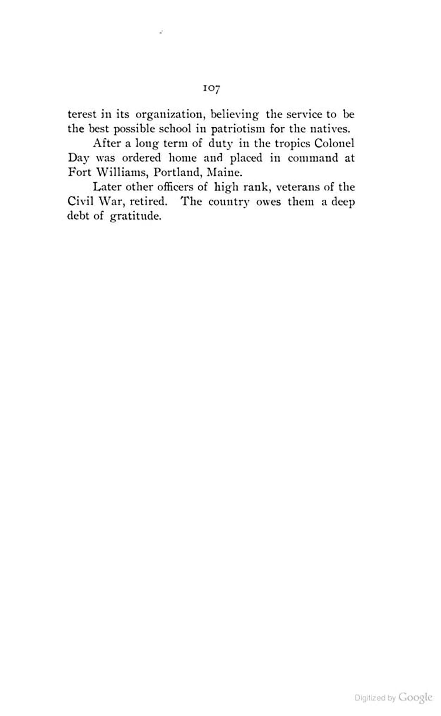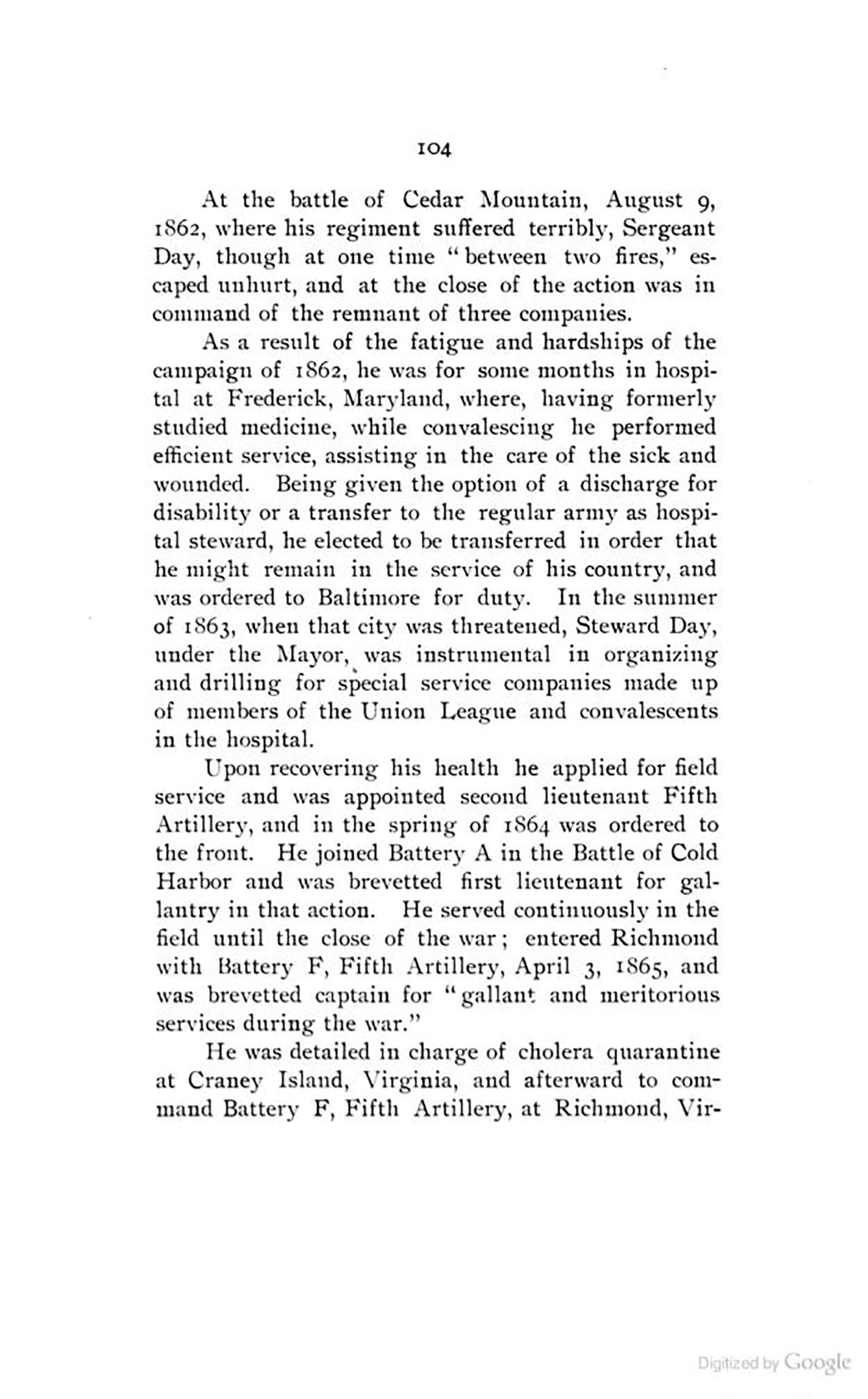 In one article there is a snippet of S.A. Day being put in charge of a few army forts in the U.S., during which time he was involved in the development of the dum dum bullet. He graduated from the Medical College of the State of South Carolina in 1880 & was known to practice as a physician & a surgeon, even caring for Jefferson Davis, the ex-president of the Confederacy. Shortly before retirement & at the opening of the Spanish War, he was commissioned major & ordered to Cuba. At the promulgation of the peace protocol he, as commandant of the artillery, hoisted the American flag over El Morro Castle at San Juan, Porto Rico, & fired the national salute on the day of occupation, October 18, 1898.