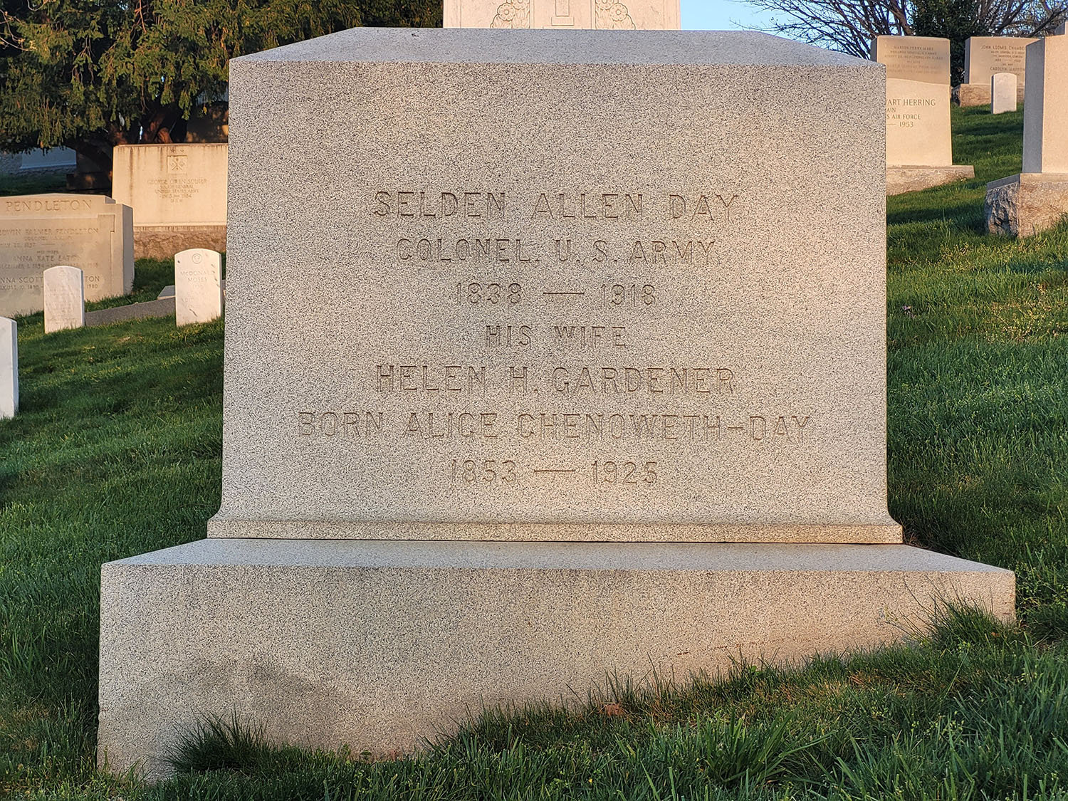 Colonel Selden Allen Day died at his home at the age of 80 on December 22, 1918 & was buried with full military honors in Arlington Cemetery, where his wife later joined him.