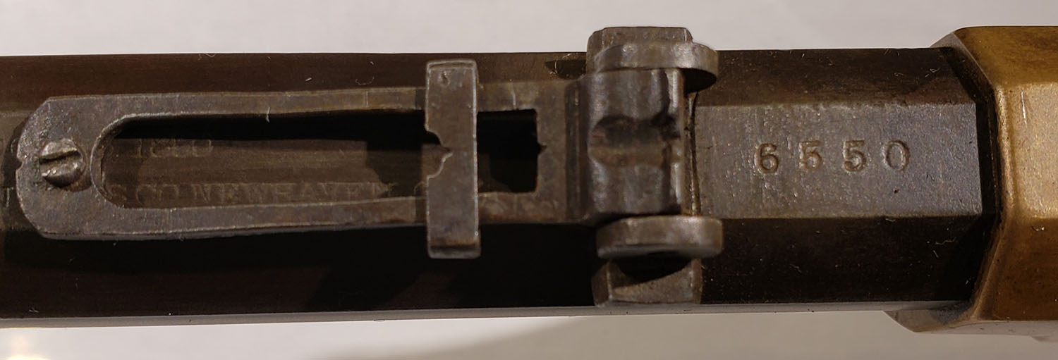 FANTASTIC Henry Repeating Rifle, First Variation, .44 Henry Cal., MFG: 1864, SN: 6550 Lever Action Rifle, Designed by Benjamin Tyler Henry & produced by the New Haven Arms Company. Henry's were used in the Indian Wars & by the Union during the Civil War. They were favored for their greater fire power than standard issue carbines, though at $30 to $40, they were a very expensive option in their day. This mid SN rifle still retains first variation rifle characteristics such as the pronounced ''Henry Drop'' profile on the rear of the receiver & the three flats on the receiver ring (receiver bridge) immediately behind the receiver & barrel joint. On this example, the original wood stock is very good to excellent & solid. The stock has been cleaned & lightly sanded & reoiled, displaying numerous small & minor dings, scratches & contusions consistent with period use. There are a couple of short & tight hairline cracks near the toe. The wood fit is very good with some shrinkage. The metal finish on the 24'' barrel has worn & toned to a thin brown patina, with a mix of added finish & with edge wear & areas of thinning worn to a gun metal gray. There are some small nicks, contusions or abrasions, & surface freckling, but no real pitting or rust. The barrel has a professionally filled 2nd rear dovetail approximately 6'' from the receiver ring. The brass frame & buttplate have both likely been cleaned in the past, but have developed nice aged color. Buttplate has a hinged trapdoor were an original 4pc hickory cleaning rod would be originally stored, although not currently present. Bore is fair, with areas of pitting amongst strong rifling. The rifle has a nickel silver front sight blade & third style folding leaf rear sight with 900 yard notch at the top of the leaf. Present are the typical sling attachments on the left side of the stock & barrel, & the faint remains of the ''Henry Bump'' can be seen below the sling provision on the stock. The top barrel flat is roll-stamped with the slightly larger style legend: ''HENRY'S PATENT. OCT. 16. 1860 / MANUFACT'D BY THE NEWHAVEN ARMS CO. NEWHAVEN. CT.'' in two lines forward of the rear sight. The serial number is stamped on the top of the barrel between the rear sight & the receiver. Matching SN's are stamped on the inside of the buttplate & on the left side of the lower tang beneath the wood. The hammer, lever & trigger are case-hardened, although the case-color has mostly worn away & developed a brown patina. There is the remains of a ''W'' proof stamping on the lower tang, which has been speculated was the inspection stamping of Oliver Winchester. The hammer has borderless knurling on the spur. All screws fit & line up correctly, are mostly unbuggered & appear original. While it is reported that as many as 14,000 Henry rifles were produced. Production of the Winchester 1866 rifle was SN intermixed starting around 12,000, so some speculate fewer that 14,000 were actually produced. With such a low production total & their heavy use during the Civil War, Indian wars & Western frontier movement, any Henry rifles is always highly collectable, but especially when found with all SN matching parts & in relatively unmolested condition such as this rifle presents. Antique, No FFL Req. - Value: 20000 to 35000