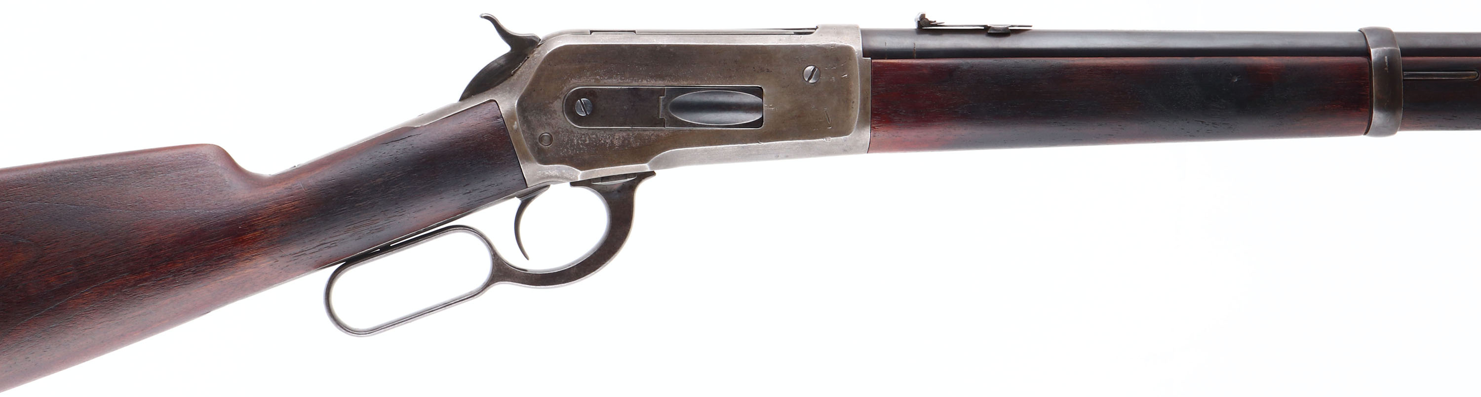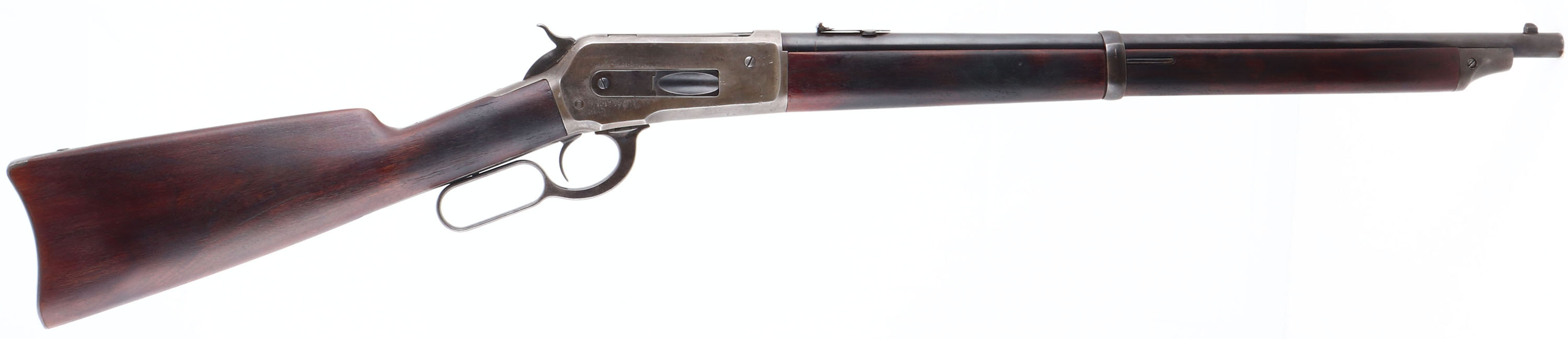 VERY RARE Winchester, Model 1886 ''Long Musket Forearm Style'' Saddle Ring Carbine, CAL: .45-70, MFG: 1889, SN: 28675, Lever Action Carbine, 22'' Round barrel, This early production carbine has the distinctive full length musket style forearm. 1886 SRC rifles with SN's below 30,000 were produced with these full length forends. These carbines were a rare variation. There were 159,996 Model 1886 rifles produced. Of the total production, only 36,524 were in 45-70 & only 6,651 carbines were produced in all calibers & barrel lengths. Of the 6,651 carbines, only 1,911 were in 45-70. Also, 352 of the 6,651 carbines were produced with ''Long Wood'', & of those only 137 were in .45-70 caliber. That makes this carbine one of only 137 examples produced in this configuration. The straight grain walnut stock & full-length forearm are excellent & solid. The stocks appear to have been cleaned, likely lightly sanded, & re-oil finished or stained. The wood remains proud to the metal in most areas, with few minor handling marks or tiny contusions. There is a thin sliver missing along the edge of the upper tang on the left side & up against the receiver. The barrel retains 90% coverage of blue finish toning a bit plum brown. The case-hardened receiver displays the faded smokey outline of faded case-colors. The top of the barrel is roll-stamped ''- MANUFACTURED BY THE-/- WINCHESTER REPEATING ARMS CO. NEW HAVEN CONN. U S. A-'' in two lines with arrows on either end of the marking. The caliber designation ''45-70'' is stamped on the top of the barrel between the rear sight & the receiver. The upper receiver tang is roll-stamped ''-MODEL 1886-''. The lower receiver tang is roll-stamped with the ''1884/1885'' patent markings in two lines behind the trigger & the SN ''28675'' in script letters ahead of the rear tang screw. Bore is excellent & bright. Barrel carries a block mounted front sight with steel blade & a folding 3 leaf rear sight. Receiver carries the staple mounted saddle ring. The stock has a carbine style buttplate. Forend has the correct model 1876 style forearm cap & spring fastened lower barrel band. A caliber .40-82 W.C.F. Model 1886 full stock carbine, SN ''14105'' is illustrated & described on page 308 of ''THE WINCHESTER BOOK'' by George Madis. Madis notes that all Model 1886 carbines are scarce & that only a few early production Model 1886 carbines were manufactured with full-length forearms. This rifle was previously sold with a correct Cody Winchester Factory Letter confirming configuration as a carbine, caliber & production date & a Winchester Rarity letter from the Cody records. However, those original letters have been misplaced by the consignor, but we do have a copy of the factory records letter. This very rare & unique carbine is highly collectible & would be a fantastic addition to any lever collection. Antique, No FFL Req. - Value: 10000 to 15000