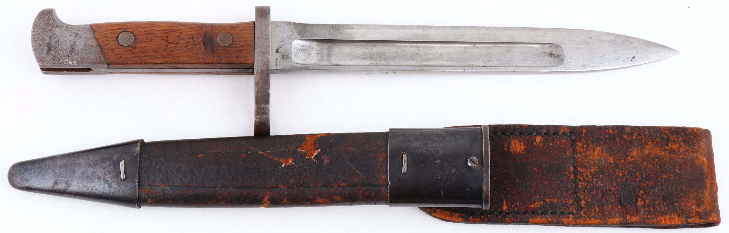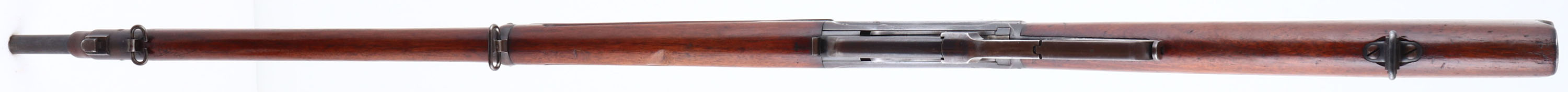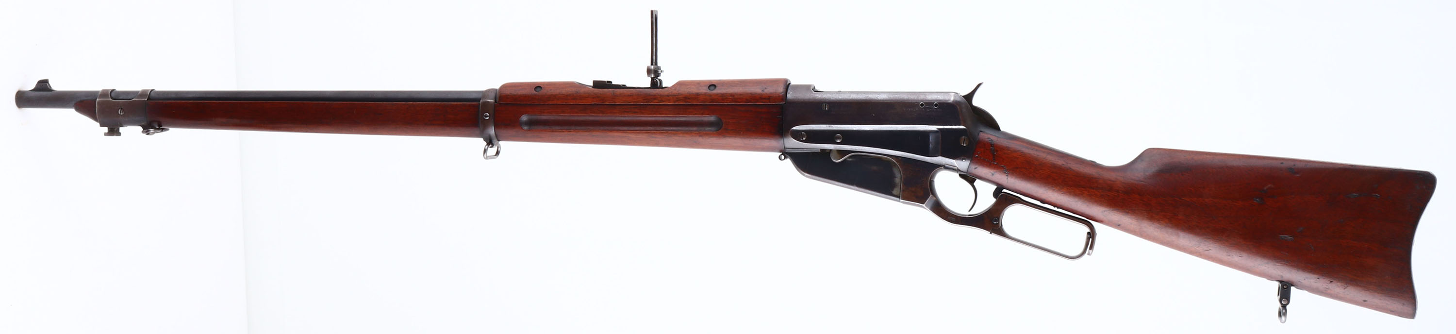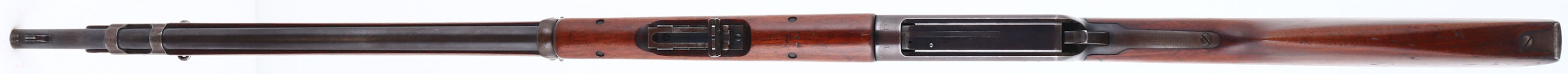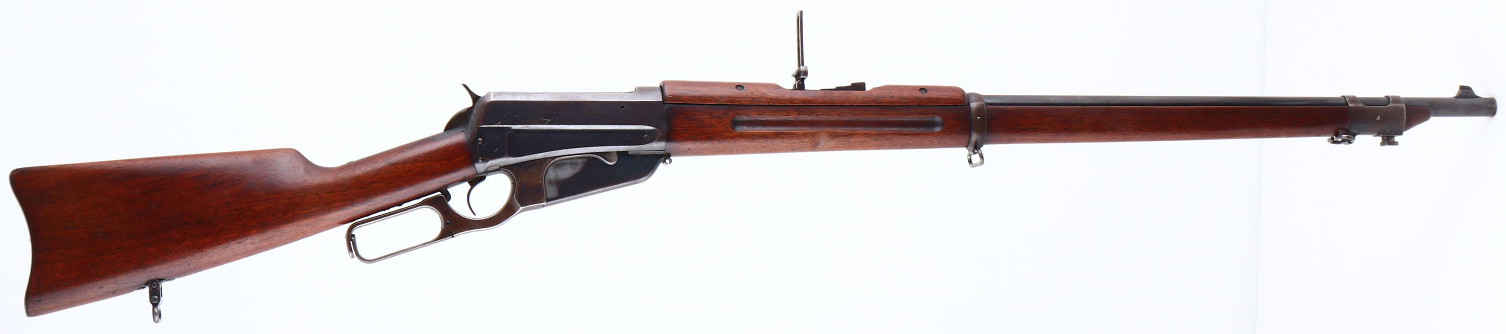 EXCEEDINGLY RARE Winchester, Model 1895 ''National Guard of Colorado'', CAL. Unmarked 30-40 Krag, MFG. 1899, SN: 19855, Lever Action, 28'' Round barrel. The right side of the receiver has the Colorado National Guard marking: ''NATIONAL GUARD OF COLORADO.'' The factory American walnut musket stocks, with finger groove forearm & hand guard are excellent, solid & original. The excellent wood finish appears original, with small scratches, scuffs & contusions. There is a large gouge on the bottom right side of the forearm, which has been smoothed & touched up. The original blue metal finish is 80% on barrel, 50% on receiver, mag & lever, with areas of loss having a thin brown patina. The top of the receiver is marked ''1D13.'' The left side of the receiver has standard Winchester markings. The musket lacks a caliber marking. The ''KSM'' Kelly S. Morse military inspectors markings are stamped on the lever & buttplate. Morse is listed as an inspector for the 1895 US contract musket. 10,000 of these rifles were purchased by the Ordnance Department with 9,900 of them being sold to Cuba. If correct, that leaves just 100 being sold to state militias of which this example was assigned to Colorado. Barrel carries a pinned blade front sight, rear aperture sight graduate to 1,800 yards & marked ''200,'' ''300,'' ''500,'' & ''700'' on the left side. Fitted with bayonet lug on the front barrel band, sling swivels & stacking loop. Comes complete with a rare ''Winchester Repeating Arms Co.'' marked bayonet, including the even rarer original metal & leather scabbard, which retains traces of original blue on the hardware. Bore is excellent. The stock carries a sliding trapdoor carbine buttplate. These Colorado National Guard Model 1895 muskets are seldom encountered & when found generally show hard use. These 1895 muskets were used extensively by the Colorado National Guard in suppressing miner's unions during the Colorado Labor Wars of 1903 & 1904. This very scarce Model 1895 variant is missing from even the most advanced Winchester collections. This unique Western American rifle of provenance is an excellent example & is very collectible in this complete & fine condition. FFL or C&R Req. - Value: 5000 to 10000