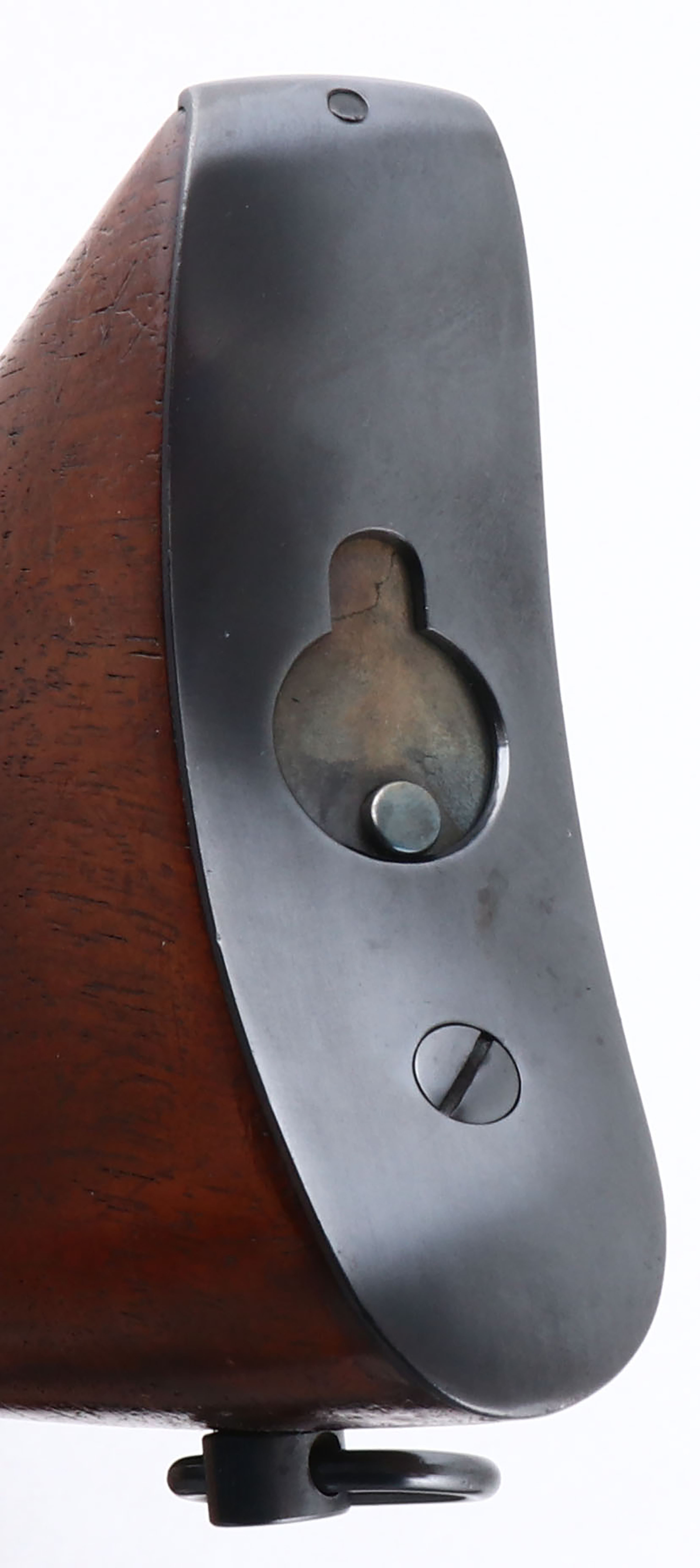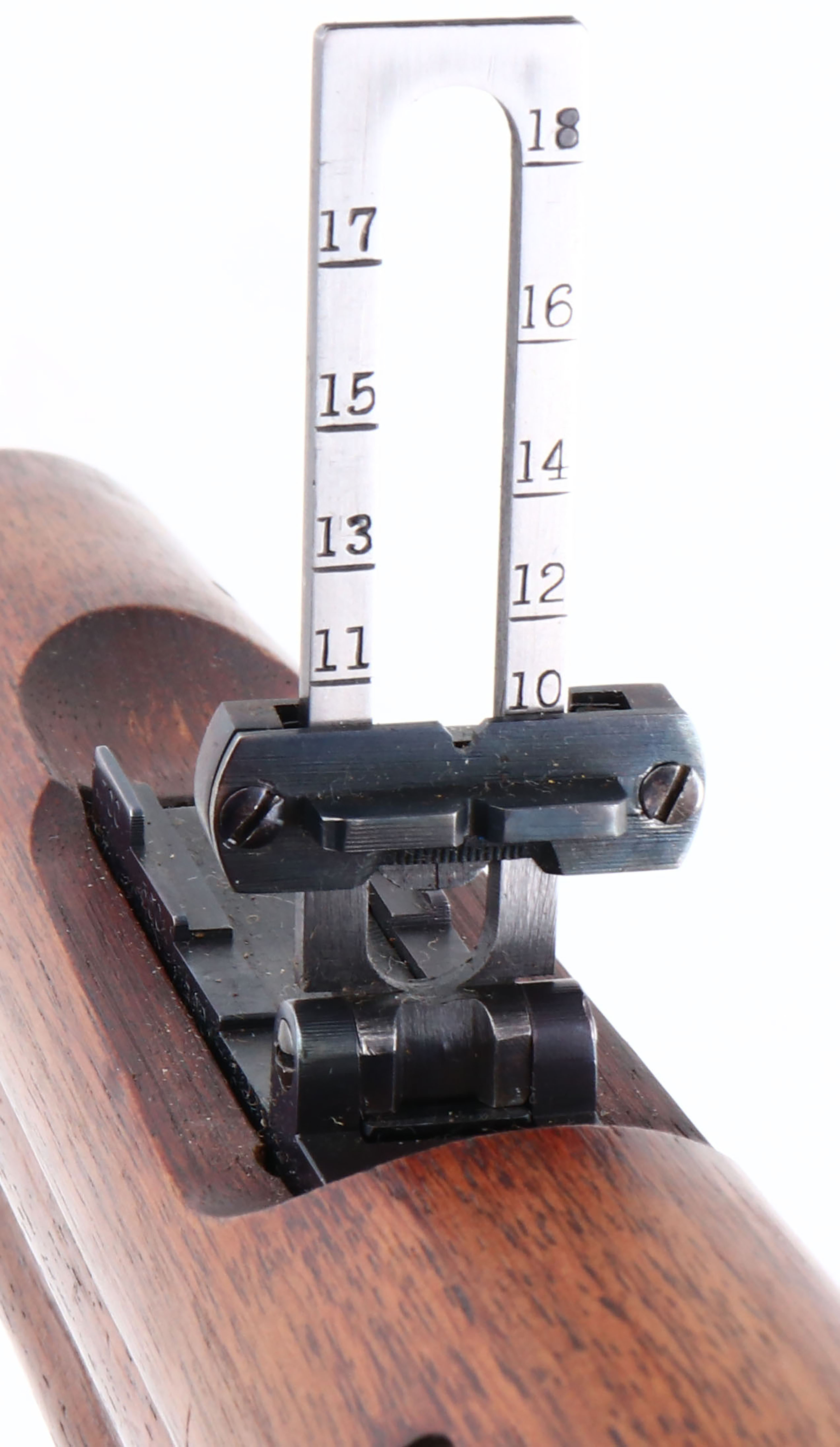 Winchester, Model 1895 SRC, CAL MARKED: .30 GOV. '06., MFG: 1915, SN: 87612 , Lever Action, 22'' Tapered round barrel. This rifle has been very nicely & professionally restored. The original wood stock & forearm are excellent & solid, with the military style top handguard likely being a correct replacement. The stocks appear to carry the original finish, but may have been cleaned long ago with some added protective oils. The display minor scuffs, dings & handling marks. The metal blue finish is excellently restored rating 95%, & preserving the markings & barrel address. Bore is excellent & bright, with crisp rifling. The barrel holds a military style rear ladder sight & elevated blade front sight. Stock carries a sliding trapdoor metal carbine buttplate. Carries the desirable saddle ring. Sling swivels. The rifle is overall excellent & still very collectible in this shape & appearance. FFL or C&R Req. - Value: 1000 to 2000