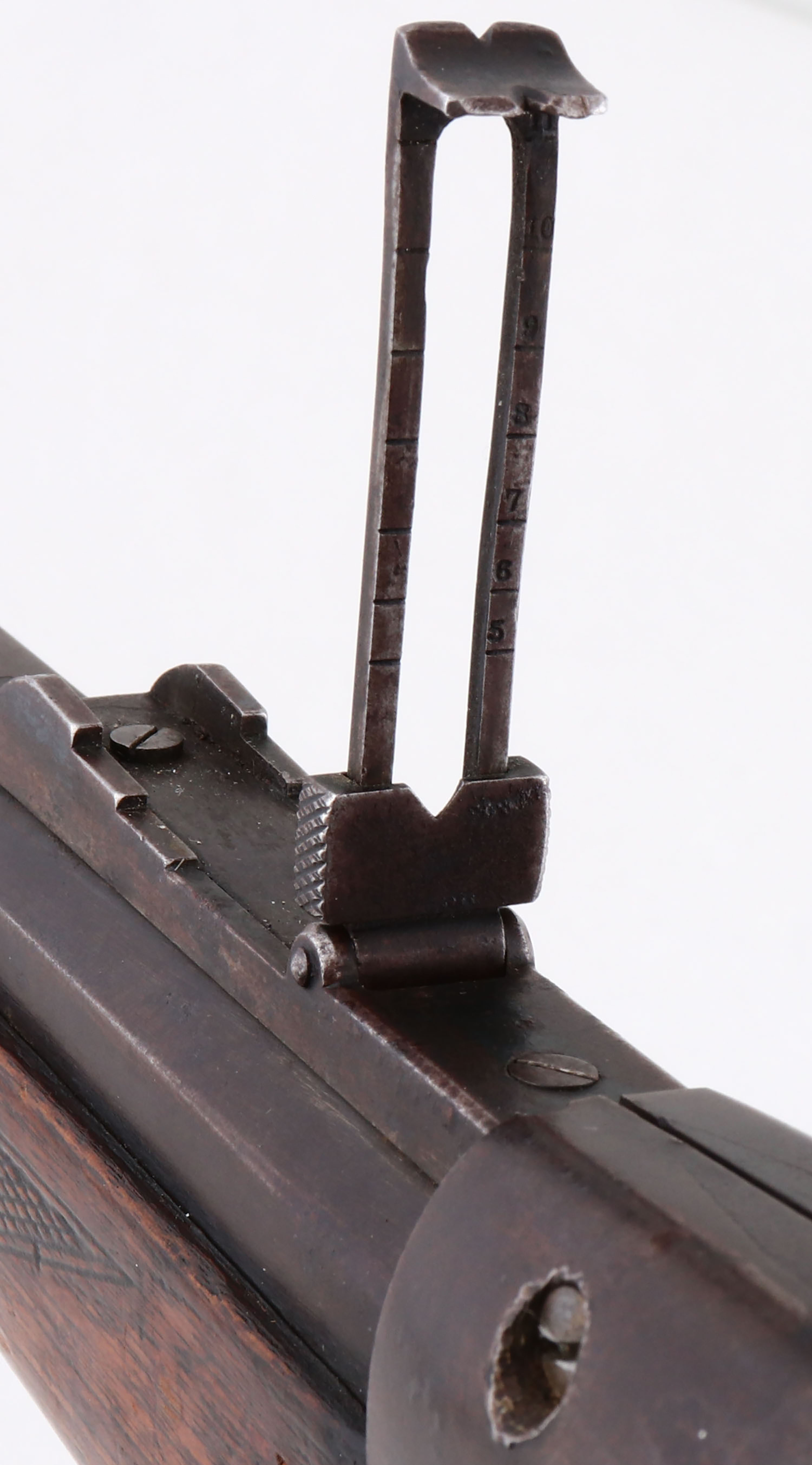 RARE Evans Sporting Rifle ''New Model'', CAL: 44 EVANS, MFG: 1873-79, SN: N/A, Lever Action Repeating Rifle, 28'' octagon barrel. The Evans lever-action repeating rifle was revolutionary for it's time. Invented by Maine dentist Dr. Warren R. Evans, with the help of his brother George, they perfected the rifle & started the ''Evans Rifle Manufacturing Company'' of Mechanic Falls, Maine in 1873. The magazine operated on the principle of the Archimedean screw & took the form of an enclosed fluted shaft that rotated within a spiral tube. As the lever was moved, the shaft rotated & the .44 Evans cartridges advanced from the tube into to the receiver, without requiring a magazine follower. In 1872, the U.S. Army announced it would hold trials to test various breechloading firearms with the intention of adopting a design suitable for use by troops. Although the Evans rifle was fired 38 times in 19 seconds with no misfires, it experienced mechanical difficulties that were sufficient enough to disqualify it from consideration. It was then promoted as a sporting rifle. A total of almost 15,000 Evans repeating rifle were produced & has the unique distinction of being the only firearm mass-produced in the state of Maine in the 19th century. The Evans rifle also had the greatest magazine capacity of any rifle mass-produced in the 19th Century, holding up to 34 rounds. The original wood stock is very good & solid, with scratches, scrapes & dings, alongside a couple gouges. The schnabel forearm is checkered & displays similar wear. Most of these rifles suffered cracks in the stock, however this example has somehow survived without cracks. The metal finish has toned to a smooth brown patina, with remnants of original blue. Bore is very good, with pitting amongst strong rifling. The barrel holds a folding ladder sight, with graduations from 1 to 4 on the right side & 5 to 11 on the right face of the ladder & a silver blade front sight, Buttstock carries a steel trapdoor loading port buttplate. Comes with (10) rounds of 44 Evans cartridges. A very unique & unusual rifle with great American history. Antique, No FFL Req. - Value: 1500 to 3500