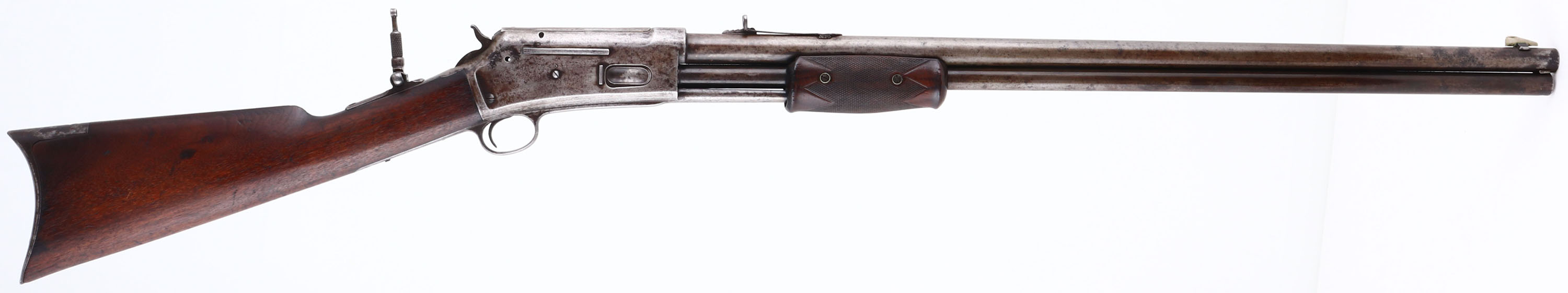 RARE Colt Lightning, Large Frame, Marked .45-85-285 CAL., MFG. 1888, SN: 1470, Slide Action Rifle, 28 1/4'' Round barrel, Full mag. Early, second year rifle. The factory stocks are excellent, with the correct checkered forend & non-checkered stock. The stock has a couple of tightly repaired 1'' cracks at the toe. The checkering on the forend remains very good, with a couple of small 1/2'' hairline cracks & edge nicks. The stocks appear to carry the original finish, with several small dings & minor scratches. The metal finish on barrel, mag & receiver has worn mostly gun metal gray, with spotty areas of brown patina. Rifle fitted with a Lyman flip-up adjustable tang sight, while the barrel carries an adjustable buckhorn rear & Rocky Mountain silver blade front sights. Bore is very good, with strong rifling & some light roughness. Crescent metal buttplate. Smooth tight action. One of only 6,496 large frame rifles were produced from 1887-94. Overall, a very nice example & fairly rare rifle. Antique, No FFL Req. - Value: 2000 to 4000