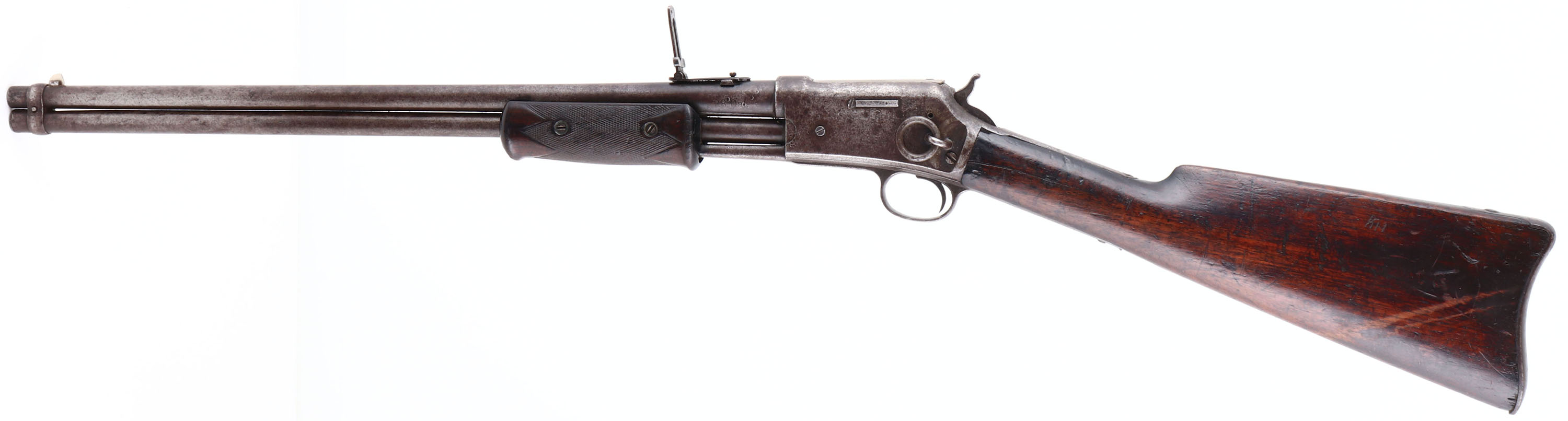 Colt Lightning, Medium Frame Saddle Ring Carbine, CAL: 38, MFG: 1889, SN: 33051, Pump Action Rifle, 20'' Round barrel, Full mag. The factory straight grip wood stock & checkered forend are very good. The stocks carry the original finish, with some darkening from use & added waxes or oils. The is a 2'' crack at the left side of the wrist & a tight grain crack emanating from the upper tang & another short tight grain crack on the forearm. There is some tiny edge chipping at the toe & a small chip at the front edge of the forend. There are also other small dings, scratches & contusions. The checkering is very good, but with smoothing from use. The original metal finish has worn mostly gun metal gray, with a spotty brown layer of patina & some remains of original finish in protected areas. Bore is fair, with spotty areas of roughness amongst strong rifling. Rifle is fitted with a flip-up ladder rear sight & a small silver blade front sight. Original saddle ring. Stock carries a carbine metal buttplate. Dust cover appears to be a replacement. A mostly original & rare example of a Colt saddle ring carbine. Antique, No FFL Req. - Value: 1000 to 2000
