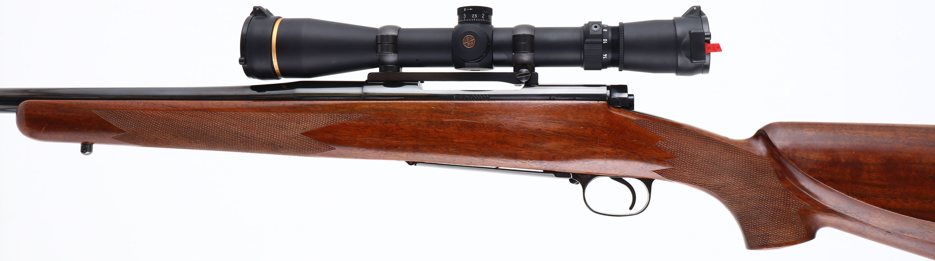 Winchester, Model 70, CAL: 35 Whelen Ackley Improved (not marked), MFG: Late 1960's, SN: G225220, Bolt Action Rifle, 24'' Heavy barrel. The original checkered flat pistol grip wood stock, with beaded cheek is excellent. There are light handling & storage marks to the original finish. The metal blue finish on the unmarked barrel is excellent, rating 97%. The receiver blue also rates 97%. There are no visible proof stampings on the barrel or receiver. There is no barrel address or legend stamped on the barrel, nor is there a visible caliber marking. Bore is excellent. The receiver holds a Leupold VX-3i 4.5-14x40mm scope, held by Leupold rings on a Redfield base. The top dial is factory marked with 35 Whelen caliber & bullet specs. No open sight provisions on barrel. Stock carries a solid black rubber recoil pad. Sling studs present. An excellent condition customized Model 70, with a high quality scope ready for the hunt. FFL or C&R Req. - Value: 800 to 1500