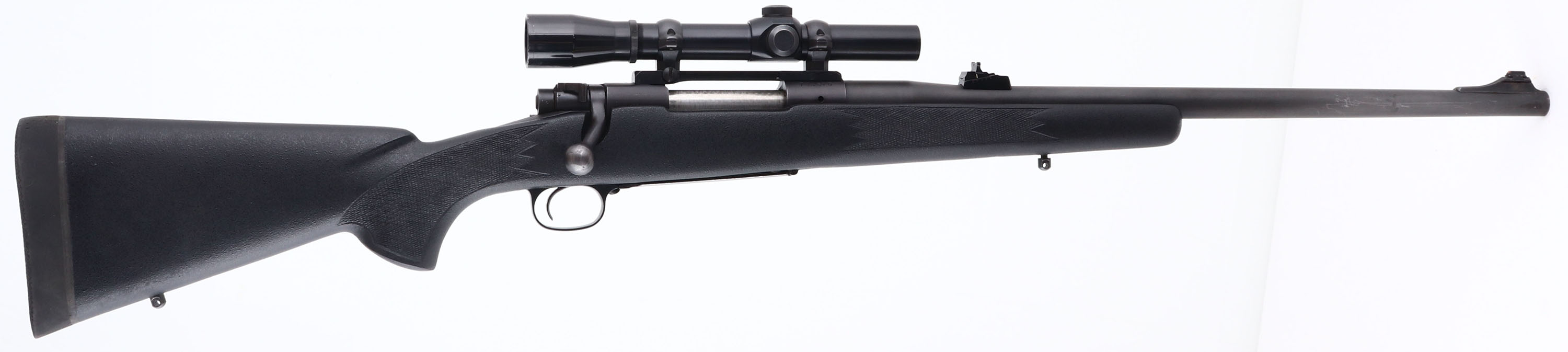 Winchester, Model 70, CAL: 375 H&H MAG, MFG: 1965, SN: 744670, Bolt Action Rifle, 21'' barrel. The checkered & flat pistol grip synthetic stock is excellent. There is an extra hole in the forend belly of the stock behind the front sling stud. The satin metal gray finish on the barrel is excellent. The satin black finish on the receiver rates 98%. 30% original blue left on trigger guard & floorplate. Bore is excellent. The receiver holds a Lyman All-American 2 1/2X scope, mounted on Redfield mounts. The barrel has a Williams adjustable rear sight & ramp elevated tall blade front sight. One additional screw filled hole in barrel just ahead of rear sight. Solid rubber recoil pad. Sling studs. FFL or C&R Req. - Value: 400 to 800
