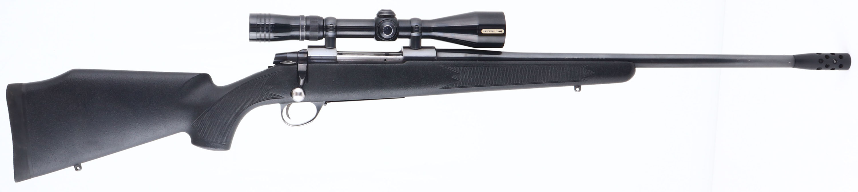 Sako, Model ''AV'' CAL: 338 WIN MAG, MFG: Modern, SN: 5904963, Bolt Action Rifle, 22 1/2'' threaded barrel, with muzzle brake. The checkered, cheeked & pistol grip Monte Carlo synthetic stock is excellent. The textured matte finish shows very little use. The metal blue finish rates 90% overall. Bore is excellent, with strong rifling. The receiver carries a Redfield Illuminator 3x9 scope. The barrel has open sight provisions, with 3 of 4 screw holes are screw filled. Stock carries a solid black rubber recoil pad. Sling studs present. This would make an excellent all weather hunting rifle. FFL Req. - Value: 500 to 1000