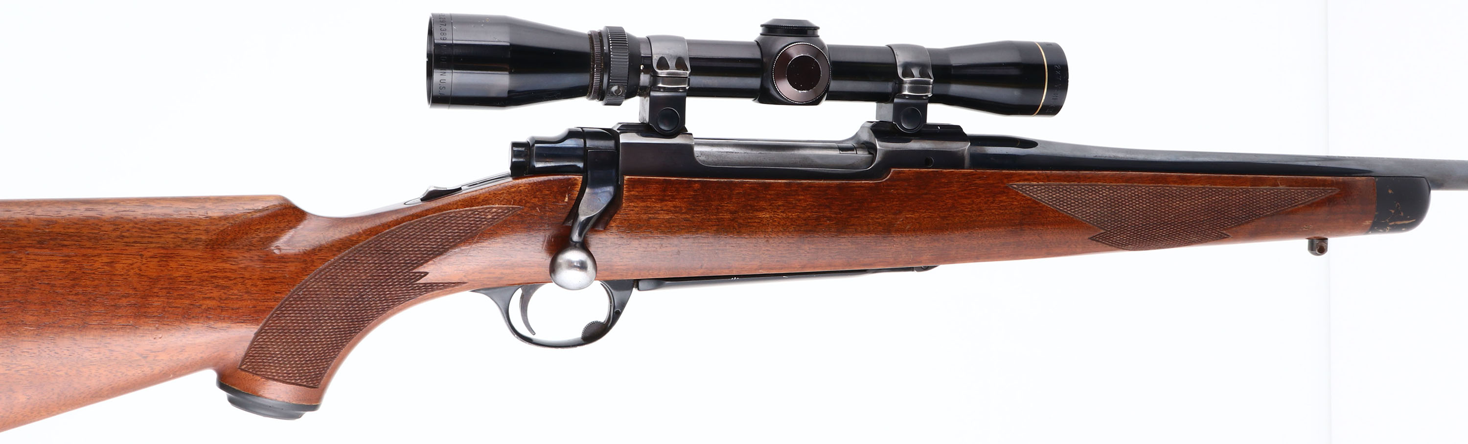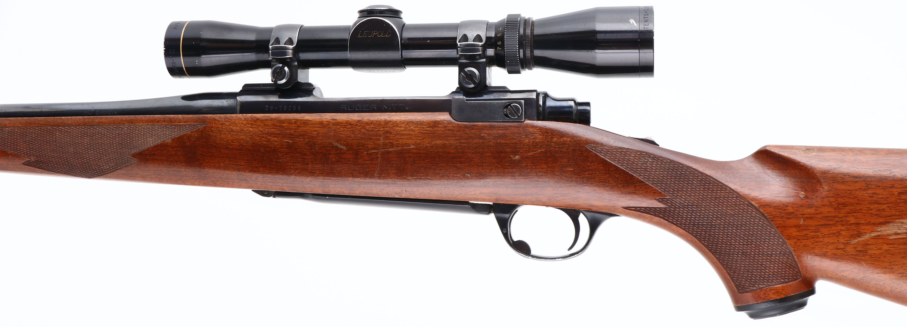 Ruger, M77, CAL: 257 Roberts, MFG: 1985, SN: 79-79255, Bolt Action Rifle, 19 1/2'' Fast tapered barrel. The checkered & capped pistol grip wood stock is excellent, with ebony forend tip. There are numerous scratches, scrapes & dings to the original finish, mostly on the comb & forend tip. The metal blue finish rates 85% overall, with edges & corners worn to metal grey. Bore is excellent & bright. The receiver holds a Leupold Vari-X II 2-7 scope, with no open sight provisions on the barrel. Stock carries a Ruger marked solid recoil pad. Sling studs. A very nice utilitarian hunting rifle. FFL Req. - Value: 500 to 900