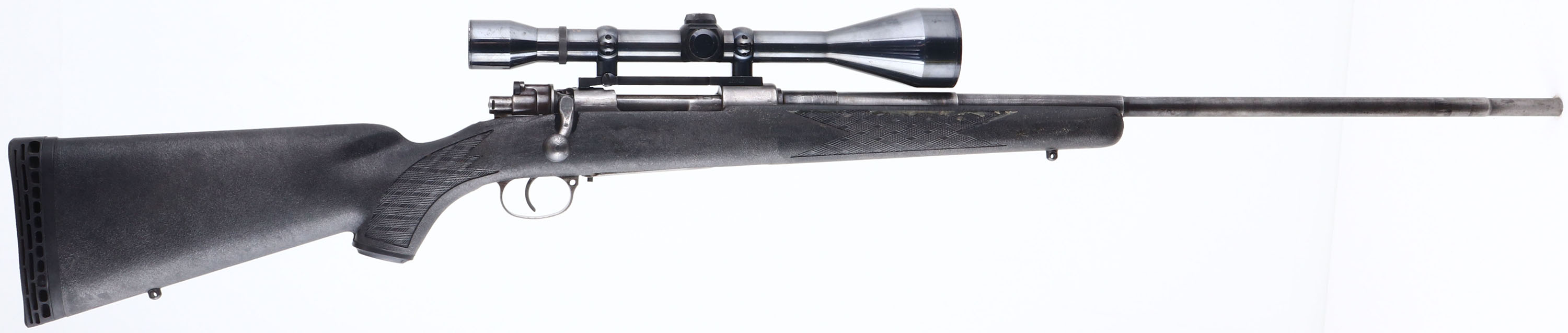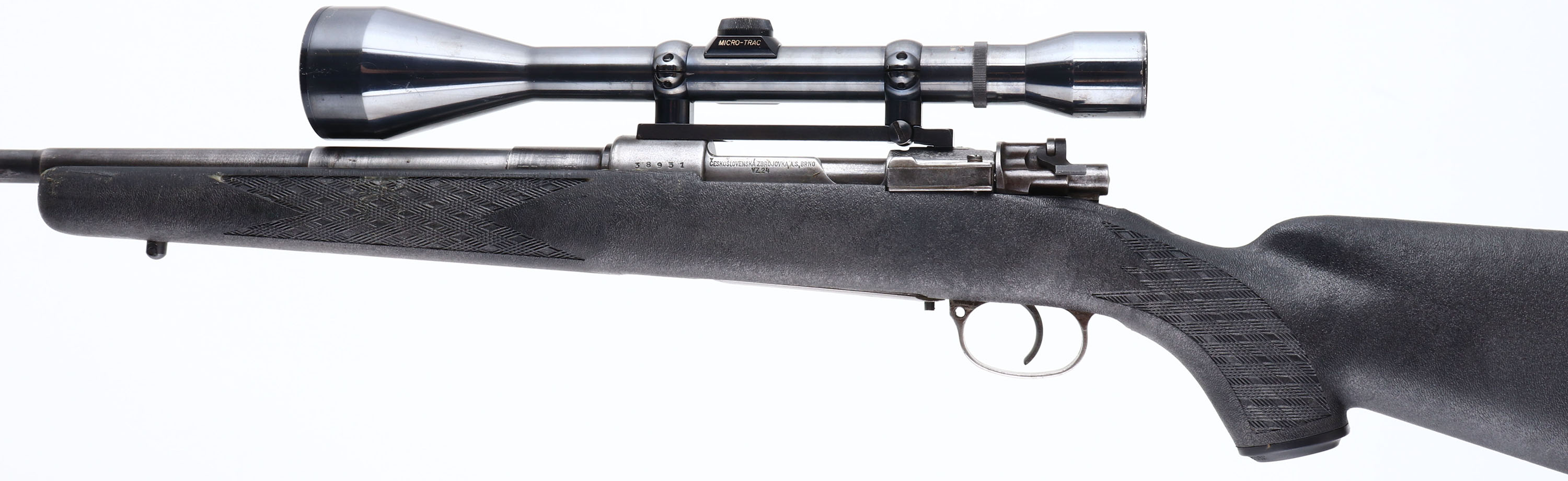 Custom Rifle, CZ, Model VZ24, CAL: 7.92x57mm, MFG: 1924-42, SN: 38931 (Receiver), Mauser type Bolt Action Rifle, 26'' step-down barrel. The Ram-Line checkered & flat pistol grip composite stock is very good, with minor scrapes & dings. There is a glue or epoxy substance on the right side of the fore grip in the checkering. The bolt notch was carved out. The metal finish has worn mostly gun metal gray, with remnants of remaining blue. Bore is very good, with strong rifling & visible light wear from honest use. The receiver holds a Weaver Micro-Trac K-856 scope. No open sight provisions. Sling studs. Ventilated recoil pad. FFL or C&R Req. - Value: 300 to 600