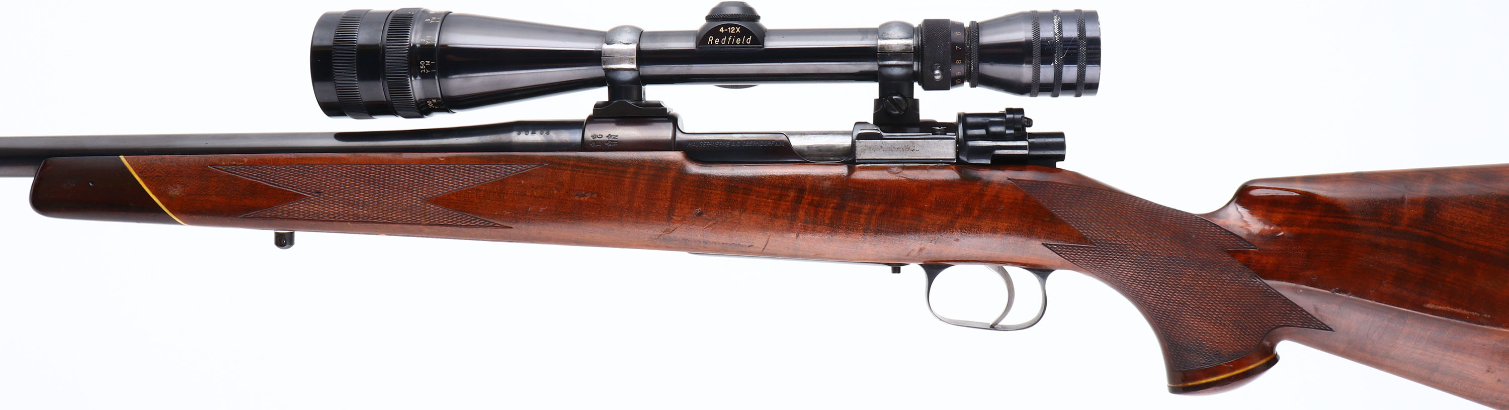 Custom Rifle, Mauser, K98K Action, CAL: 30-06, MFG: N/A, SN: 20132, Bolt Action Rifle, 26 1/2'' barrel. The checkered, cheeked & flat pistol grip Monte Carlo wood stock, with redwood forend tip & pistol grip cap, is excellent. There are contusions, scrapes & dings to the applied high gloss finish, which shows some crinkling or spiderwebbing. The metal blue finish on the barrel rates 95%. The 90% receiver finish has toned plum. Bore is excellent. The receiver holds a Redfield 4-12x scope. No open sight provisions. Sling studs. Checkered plastic buttplate. A customized hunting rifle built on a Mauser 98 action. FFL or C&R Req. - Value: 400 to 800
