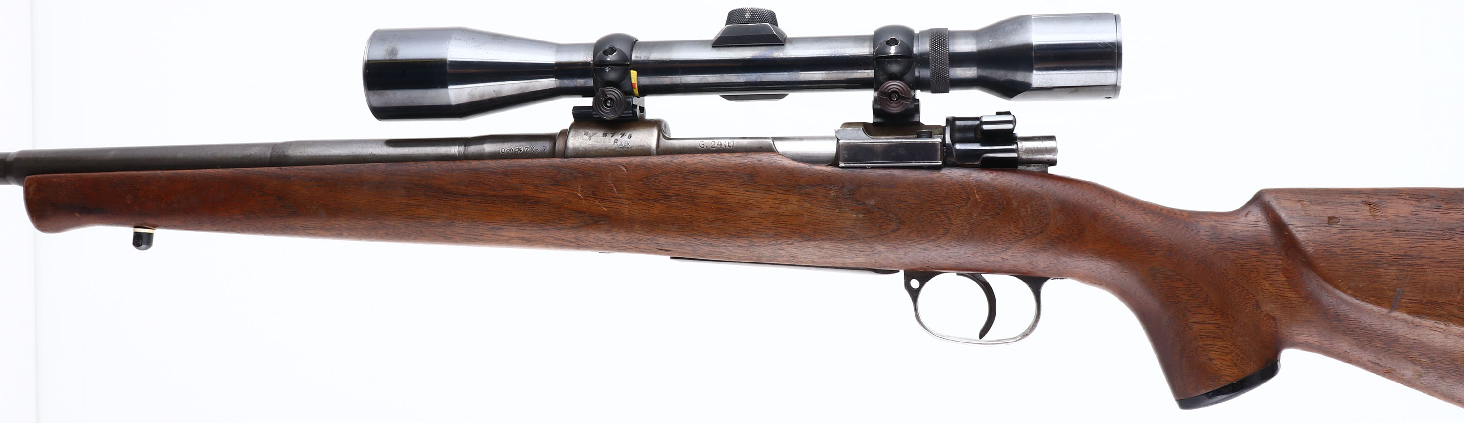 Waffenfabrik Brunn (Czech), Model: G.24 (T), Cal: 7x57mm, MFG: 1938-42, S/N: 5775, Bolt action rifle, 24'' Barrel. The capped pistol grip & cheeked monte Carlo sporting stock is very good with light scratches, small dings & wear from use. There is a small edge chip at the toe. The receiver has worn gun metal gray, with brown patina. The metal finish on the barrel has thinned & toned gray, with 50% coverage. Left side of receiver is marked with iron eagle proof mark, S/N, ''FOX'', ''G.24(T)''. The right side of receiver is marked with additional proof marks. The left side of barrel is marked, ''0'', X'd out number, X'd out number, ''7X57''. The top of barrel is marked ''89''. The right side of barrel is marked with proof marks. Bore is very good. Mounted with an unmarked scope, which appears to be a Redfield. Stock carries a BISHOP plastic checkered buttplate. Sling studs. FFL or C&R Req. - Value: 200 to 400