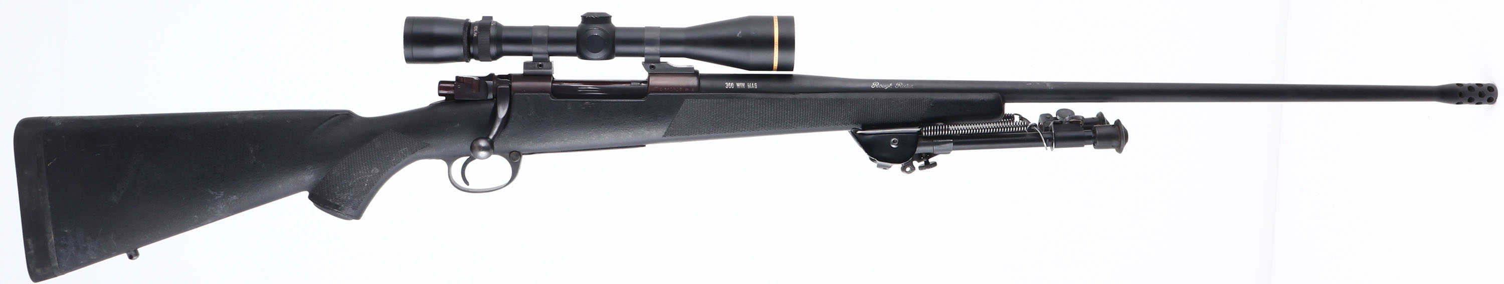 Custom Rifle, Interarms, Mark-X, CAL: 300 WIN MAG, MFG: modern, SN: A314645, Bolt Action Rifle, 26'' barrel, (27 1/2'' w/ muzzle brake). The checkered, capped, cheeked & pistol grip composite stock is very good, with small scuffs, dings & scrapes. The matte black finish on the barrel rates 97%. The right side of the barrel is marked ''Rough Rider'' in cursive. The finish on receiver rates 90%, toned to a plum patina. Bore is excellent & bright. The receiver holds a Leupold Vari-X III 3.5x10 scope. No open sight provisions. Stock carries a Outers bipod & solid black recoil pad. Single rear sling stud. A rifle of Yugoslavian origin, imported by Interarms in the 1990's. FFL Req. - Value: 400 to 800