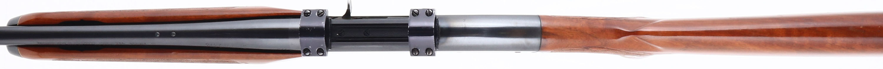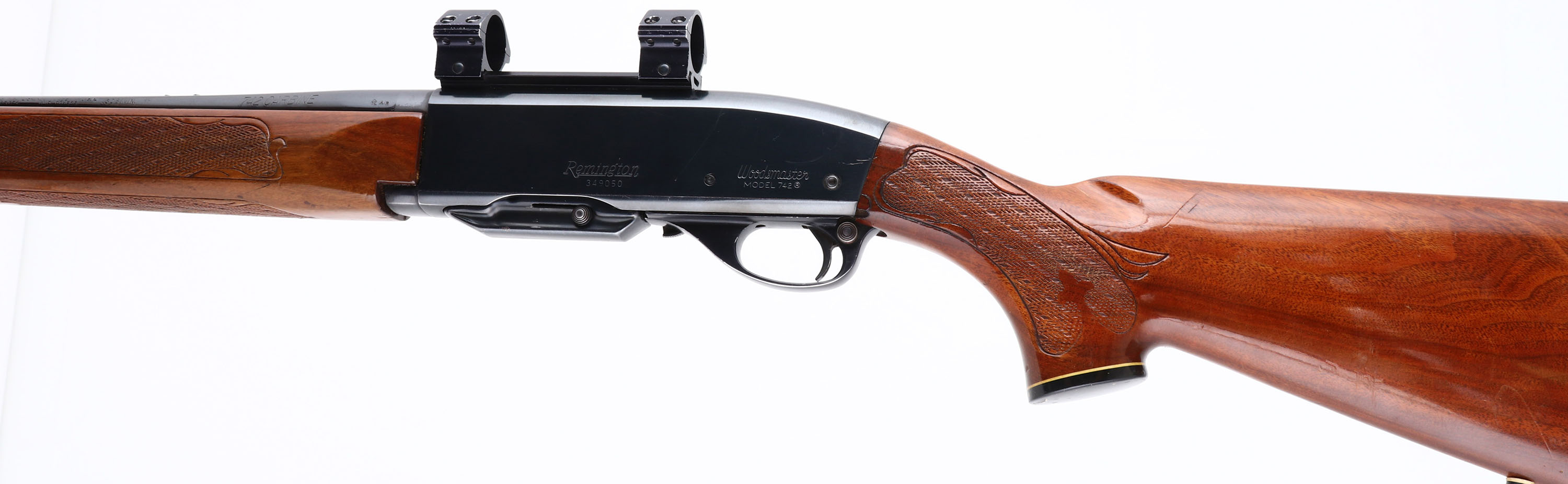 Remington Model 742 Woodsmaster Carbine, CAL 308 Win, MFG: 1968, SN: 349050, Semi-Auto Pump Action Rifle, 18 1/2'' barrel. The high gloss, checkered, capped pistol grip wood stocks are excellent. There is some spotty areas of rub & use wear to the finish. Some finish flaking on the pistol cap. The metal blue finish rates 95%. Bore is excellent. The receiver carries a scope mount & rings, while the barrel holds the screw filled holes from removal of the original sights. Buttstock carries a Remington marked, checkered black plastic buttplate. Removable mag. Sling studs. A very nice example of a newer 742. FFL or C&R Req. - Value: 400 to 800